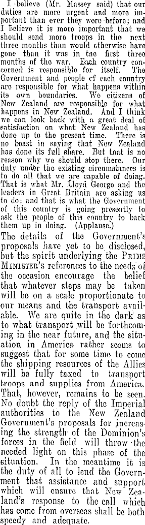 I believo (llr. Massey said) that our duties are more urgent and moro important than ever they were before; and I Tielicvo it is moro important that we should send moro froops in tho next three months than would otherwise have gone than it was in tne first tlireo months of tho war. Each country concerned is responsible for itself. The Government and people cf each country aro responsible for what happens within its own boundaries. Wo citizens of New Zealand are responsible for what happens in New Zealand. And I think wo can look back with a great deal of satisfaction on what New Zealand has dono up to the present time. There is no boast in sayinjr that New Zealand has done its full sfiare. But tnat is no reason why wo should stop there. Our duty undfor tho existing circumstances is to do all that wo are capable of doing. That is what Mr. ILloyd Gcorgo and the leaders in Great Britain aro asking us to do; and that is what the Government of this country is going presently to ask the people of this country to back them up in doing. (Applause.) Tho details ol the Government's proposals have yet to bo. disclosed, but the spirit underlying the Peijik Minister's references to tho needs of the oocasion encourage the belief that whatever steps may be taken will bo on a scale proportionate to our means and the transport available. We are quite in the dark as to what transport .will be forthcoming in the near future, and the situ-; ation in America rather scorns to suggest that for some time to come the shipping resources of the Allies will be fully taxed to transport troops and supplies from America. That, however, remains to be seen. No doubt the reply of the Imperial authorities to the New Zealand Government's proposals for increasing tho strength 1 of the Dominion's forces in the field will throw -the needed light on this phase of the situation. In the meantime it is the duty of all to lend the Government that assistance and support which will ensure that Now Zealand's response to the call which has come from overseas shall be both speedy and adeauate.
