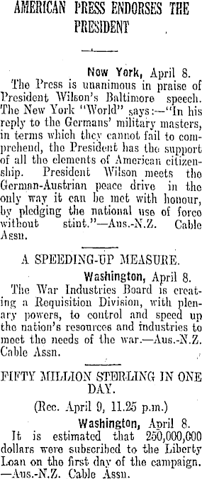 AMERICAN PRESS ENDORSES THE PRESIDENT Now York, April 8. The Press is unanimous in praise of President Wilson's Baltimore speech. The New York "World" says:—"ln his reply to the Germans' military masters, in terms which they cannot fail to comprehend, the President has tho support of all tho dements of American citizenship. President Wilson meets tho Gcrman-Austrinn peace drive in the only way it can be mot with honour, by pledging the national use of force without stint."—Aus.-N.Z. Cable Assn. A SPEEDING-UP MEASURE. Washington, April 8. The War Industries Board is creating a Requisition Division, with plenary powers, to control and speed up the nation's resources and industries to moot tho needs of the war.—Aus.-N.Z. Cable Assn. FIFTY MILLION STERLING IN ONE DAY. (Bee. April 9, 11.25 p.m.) Washington, April 8. It is estimated that 250,000,000 dollars were subscribed to the Liberty Loan on the first day of the campaign. —Aus.-N.Z. Cable Assn.