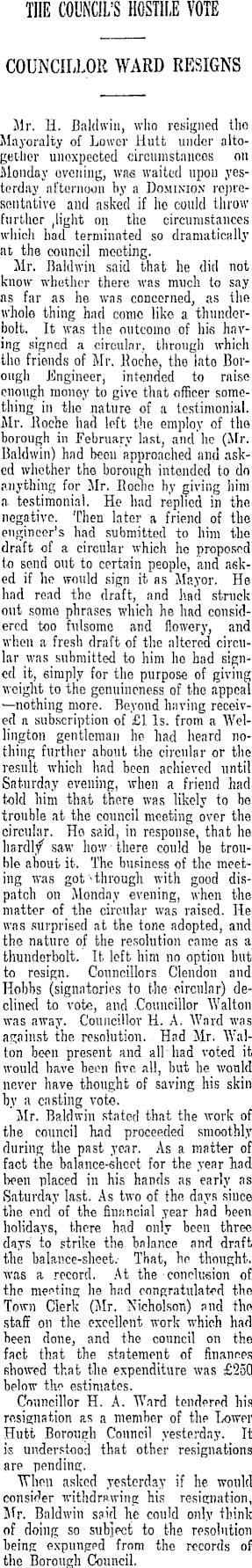 THE COUNCIL'S HOSTILE VOTE COUNCILLOR WARD RESIGNS Mr. H. Baldwin, who resigned tho Mayoralty of Lower Hutt under altogether unexpected circumstnncos on Monday ovening, was waited upon yesterday afternoon by a Dominion representative and asked if ho could throw further ,light on the circumstances which bad terminated so dramatically at the council mooting. Mr. Baldwin said that he did not know whether there was much to say as far as he was concerned, as the whole thing had conic like a thunderbolt. It was the outcomo of his having signed a circular, through which tho friends of Mr. Eoche, the lato Borough .Engineer, intended to raise enough money to give that officer something in the nature of a testimonial. Mr. .Roche had left the employ of the borough in February last, and he (Mr. Baldwin) had been approached and asked whether tho borough intended to do anything for Mr. Roche by giving him a testimonial. He had replied in the negative. Then later a friend of the engineer's had submitted to him the draft of a circular which ho proposed to send out to certain people, and asked if he would sign it as Mayor. Hβ had read tho draft, and had struck out some phrases which he had considered too fulsome and flowery, and when a fresh draft of the altered circular was submitted to him he had signed it, einiply for the purpose of giving weight to the genuineness of the appeal more. Beyond having received a subscription of £1 Is. from a Wellington gentleman he had heard nothing further about the circular or the result which had been achieved until Saturday evening, when a friend had told him that there was likely to bo trouble at the council meeting over the circular. Ho said, in response, that he hardl/ saw how there could be trouble about it. The business of the meeting was got'through with good dispatch on Monday evening, when the matter of the circular was raised. He was surprised at the tone adopted, and the nature of the resolution came as a thunderbolt. It left him no option but to resign. Councillors Clendon and Hobbs (signatories to the circular) declined to vote, and .Councillor Walton was away. Councillor H. A. AVard was against the resolution. Had Mr. Walton been present and all had voted it would have been five all, but he would never have thought of saving his skin by a casting vote. Mr. Baldwin stated that the work of the council had proceeded smoothly during the past year. As a matter of fact the balance-sheet for the year had been placed in his hands as early as Saturday last. As two of the days since the end of the financial year had been holidays, there had only been three days' to strike the balance and draft the balance-sheet.- That, he thought, was a record. At the -conclusion of the meeting he had congratulated the Town Clerk (Mr. Nicholson) and the staff on the excellent work which had been done, and the council on the fact that the statement of finances showed that the expenditure was £250 below the estimates. Councillor H. A. Ward tenderpo , his resignation as a member of thp Lower Hutt Borough Council yesterday. It is understood that other resignations are pending. When asked yesterday if he would consider withdrawing his resignation, Mr. Baldwin said he could only think of doing so subject to the resolution being expunged from the records of the Borough Council.