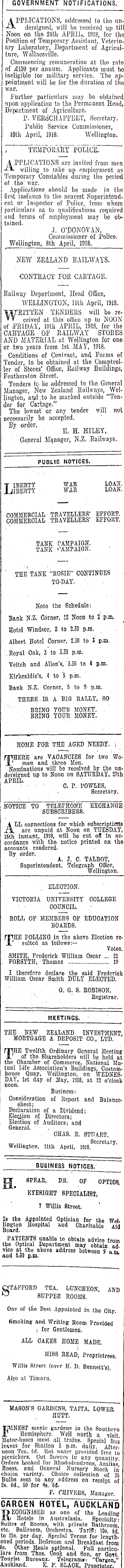 GOVERNMENT NOTIFICATIONS, A PPLICATIOKS, addressed (o tho un- -£-»- dorsignert, will bo received up till Noon on the 24th APBII/, 191S, for tho Position of Temporary Assistant, Veterinary Laboratory, Department of Agriculture, Wallaceville. Commencing remuneration at the rate of ,£l3O per annum. Applicants must bo ineligible for military service. The appointment will be tor the duration of tho war. I'lirther particulars may bo obtained upon application to the Permanent Head, Department of Agriculture. P. VURSCHAIT.BLT, Secretary. Public Service Commissioner, 10th April, 1918. Wellington. ', TiMTORIBYI'CJLiCEI A PPL] CATIONS are invited from men -£•*- willing to take up employment as i Temporary Constables during Uiu period ! of the' war. Applications should be made in tho first inefauco to tho nearest Superintend, put or Inspector of Police, from whom particulars ns to qualifications required and terms of employment may be obtnined. J. O'DONOVAN, Commissioner of Police. Wellington, Bth April, 1918. NEW ZEALAND RAILWAYS. CONTEACT FOE CAETAGE. Railway Department, Head Office, WELLINGTON, Hlli April, 1918. W BITTEN TENDEUS. will be.received at this office up to NOON of -FRIDAY, liltli APRIL, 1918, for the CAETAGE• OP RAILWAY STORES I AND MATERIAL at Wellington for one or two years from Ist MAY, 1918. Conditions of Contract, and. Forms of Tender, lo be obtained at the Comptroller of Stores' Office, Railway Buildings, Featherston Street. Tenders to bo addressed to the General Manager, New Zealand Railways, Wellington, aiyi.to be marked outsido "Tendor for Cartage." The lowest or any tender will not necessarily bo accepted. By order, E. H. HILEY, General Manager, N.Z. Railways. PUBLIC NOTICES. LIBEETT WAR LOAK. IBERTY. ' WAS. LOAN. COMMERCIAL TRAVELLERS' EFFORT. COMMERCIAL TRAVELLERS' EFFOKT. .TANK CAMPAIGN. TANK i'AMPAIGN. ' THE TANK "ROSIE" CONTINUES TO-DAY. '. Note the Schedule: Bank N.Z. Corner, 12 Noon to 2 p.m. Hotel Windsor, 2 to 2.50 p.m. Albert Hotel Corner, 2.30 to.! p.m. . Royal Oak, 3 to 3.30 p.m. Vcltch and Allen's, : 3.30 to < p.m. . . . KMtoaldie's, 4 to '5 p.m. Bank N.Z. Corner, 5 to 9 p.m. THERE IS. A BIG BALLY, SO BRING YOUR MONEY. . BRING YOUB MONEY. HOME FOE THE AGED NEEDY. ; nPHERE are VACANCIES for two WoJL' men and three Men, Nominations will be roooived by the undersigned up to Noon on.SATURDAY, 27th APRIL. ' ' 0. P. I'OWLES, Secretary. NOTICE TO TELEFHONE EXCHANGE SUBSCRIBERS. A LL connections for which subscriptions t\ are unpaid at Noon on TUESDAY, 16th instant, 1918, will be cut oil In accovdanco with the notice printed on tho acoounts rendered. By order. A. J. 0. TALBOT, Superintendent, Telegraph Office, Wellington. ELECTION. VICTORIA UNIVERSITY COLLEGE COUNCIL. ROLL OF MEMBERS OF EDUCATION BOARDS. nPHE POLLING in the above Election reJL' ' suited as follows:— Votes. SMITH, Frederick William Oscar .„ 22 . FORSYTH,. Thomas 19 I therefore declare the eaid Fredcriok William Oscar Smith DULY ELECTED. G. G. S. ROBISON, Registrar. MEETINGS. THE NEW ZEALAND INVESTMENT, MORTGAGE & DEPOSIT CO., LTD. TIHE Twelfth Ordinary General Meeting of tho Shareholders will be held at the Chamber of Commerce, National Mutual Life Association's Buildings, Customhouse Quay, Wellington, on WEDNESDAY, Ist day of May. 1918, at 12 o'clock noon. Business: Consideration of Report and Balancesheet; Declaration of a Dividend; Election o£ Directors; Election of Auditors; and General. . • ■ . OHAS. R. STUART, WcUinston, 11th April, NM. 8 *" , *I*l7,1* 17, BUSINESS NOTICES. JTT SPEAR, DR. OF OPTICS, EYESIGHT SPECIALIST, ? Willis Street, Is the Appointed Optician (or the Wei. lington Hospital and Charitable Aid Beard. PATIENTS unable to obtain advice from the Optical Department may obtain advice at the abovo address between 9 am and 6.30 p,m. STAFFORD TEA. LUNCHEON, AND SUPPER ROOMS. One of tlie Bent Appointed in the City. Smoking and Writing Room Provided ) for Gentlemen. , ALL CAKES HOME MADE. \ MIBS READ, Proprietress. Willie Strcel (over H, D. Bennett'e). Also at Tiniaru. MASON'S GARDENS, TAITA, LOWER IIUTT. FINEST Bcenlc gardens in tho Southern Hemisphere. Well worth a visit Motor-buses "icnt all trains. Special Bus leaves for Station 5 p.m. daily. Afternoon Tea, Cd. Hot witter provided free to picnickors. (Jut flowers in uny quantity. Orders booked for Rhododendrons, Azalias Hoses, and Gcuorul Nureory Stock in choice variety. Ohoicii collection of 25 Bulbs mint to any nddrces on reccint nf 2s. 6d, 60 for Is. it, " FjOIIVERS, Manager. CARCEN HOTEL, AUCKLAND REOOONIBM) m onD of tho Loading Hotels In Auntralanla, Specialty Suites of Rooms, with private Bathroom, etc. Ballroom, Orohcflt.ru. Tnrlfi: 10s. 6d to 15s. per day. Hpcclnl Terinß for lengthened periods. Bedroom and Drcakfast from 6a. Other Meals optional. Full particulars from Thoa. Coolt tttirt Bon, or Gott Tourist Buroaux. Telogram»r "Oargon," Auoklond. E. F. BLAOK. Piobriator.