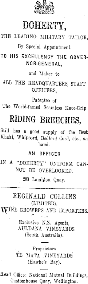 DOHERTY, THE LEADING MILITARY TAILOR, By Special Appointment TO HIS EXCELLENCY THE GOVER-NOR-GENERAL, and Maker to ALL THE HEADQUARTERS. STAFF OFFICERS, Patentee of Tho World-famed Seamless Knee-Grip RIDING BREECHES, Still has a good supply of fte Best Khaki, Whipcord, Bedford Cord, etc., on hand. AN OFFICER IN A "DOHERTY" UNIFORM CANNOT BE OVERLOOKED. 203 Larabton Quay. REGINALD COLLINS (LIMITED), \yiNE GROWERS AND IMPORTERS. Exclusive N.Z. Agents, AULDANA VINEYARDS (South Australia). Proprietors TE MATA VINEYARDS! (Hawko's Bay). Head Office: National Mutual Buildings, Customhouse Quay, Wellington.