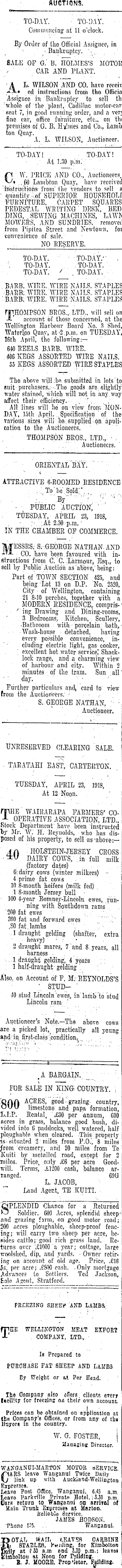 AUCTION! TO-DAY. TO- J) AY. C'oinmimciajf at 11 o'clock. By Order of the Official Assignee, in ■. Bankruptcy. '-~.'. BALE OF G.' B. HOLMES'S MOTOR- / CAR AND PLANT. ■■ A L. WILSON AND CO. have receivJ\t e<l instructions from tho Official Assignee in: Bankruptcy to sell the 'whole of' the plant, Cadillac motor-ear, eeat 7, in good running 'order, and a very fine ear, office ' furniture, etc., on tho premises of.G. B. HV.nies and Co., Lambton Quay. A, L. WILSON, Auctioneer. TO-DAY! TO-DAY! / • ; At 1.30 p.m.' CW. PRICE AND CO., Auctioneers. »... pO Lambton Quay, have received ''instructions' from' Hie vendors to sell a ' quantity :.of"SUPERIOR' HOUSEHOLD FURNITURE, CARPET SQUARES, PEDESTAL WRITING' DESK, BEDDING, . SEWING MACHINES, LAWN MOWERS, AND SUNDRIES, removed from Pipitea Street and Newtown, for convenience of sale. NO RESERVE. TO-DAY. ' -TO-DAY." . TO-DAY. . TO-DAY. TO-DAY. ' . TO-DAY. BARB. WIRE. WIRE NAILS. STAPLES BARB: WIRE. WIRE NAILS. STAPLES ' BARB; WIRE. WIRE NAILS. STAPLES THOMPSON 8R05.,. LTD., will seli on account of those concerned, at the , Wellington Harbour Board No. S Shed, Waterloo Quay, at'■2,p.m. on TUESDAY, 16th April, the following:— 640 REELS BARB. WIRE. 406 KEGS ASSORTED WIRE NAILS. 55 KEGS ASSORTED WIRE STAPLES The above will :b<% submitted in. lots to suit purchasers. , .-.Tho goods are; slightly, water stained, which will not in any way affect their efficiency.- . ".. All lines will be on view from DAY, 15th April. ..Specification of the l various sizes will be. : supplied on apulication to the Auctioneers. THOMPSON BROS., LTD., • : . ..'"'. Auctioneers. "'ORIENTAL BlYi "■■■■ ATTRACTIVE 6-EOQJIED RESIDENCE .-'■ To'be. Sold:' .- ■ ■:.-■■ ■■.By""■'■■■■;■"•" I'; "'[>. • t PUBLIC AUCTION, '" TUESDAY, APRIL 23, 1918, ■ ;. ;At 2;30p.m. ■ IN THE CHAMBER OP COMMERCE. MESSRS.- S. .GEORGE NATHAN. AND • CO. have ten.favoured with instructions from C. C.Larmpur, Esq., to sell by Public' Auction as above, being: Part of TOWN SECTION 425, and being Lot 13 on D.P. No. 2520, ■ City •■ of .Wellington, containing 21 8-10 perches, together with a MODERN RESIDENCE, compris- • '' ing Drawing and Dining-rooms, 3 Bedrooms,. Kitchen,. Scullery, •Bathroom with porcelain, bath,-Wash-house detached, having every possible convenience, including electric light, gas cooker, excellent hot water service? Shacklock range, and a charming view of harbour and city. Within 2 minutes of the tram. Sun all' ' : day. Further particulars and, card to' view from the Auctioneers.' .- S. GEORGE NATHAN, ; : ; Auctioneer. UNRESERVED CLEARING SALE. ■ TARATAHI EAST, CARTERTON. TUESDAY, APRIL 23, 1918, At 12' Noon. THE WAIRARAPA FARMERS' COOPERATIVE ASSOCIATION, LTD., Stock Department have been instructed fcy Mr. W; If.' Reynolds, who has disposed of his property, to sell as'above :— A(\ ■■■ HOLSTBIN-JERSEY CROSS -*V DAIRY COWS, in full milk . (factory dates) . . 6; dairy cows (winter milkers) ■■ 4 prime fat cows 10 8-month heifers (milk fed) 1 8-month Jersey bull • - 100 4-year Romney-Lincoln ewes, running with Southdown rams '200 fat ewes ' ■ ~ ' ' ■'. 300 fat and forward ewes '■.'' .SO fat.lambs 1 draught gelding (shatter, extra heavy) '■- : 2 draught mares, 7 and B',years, all harness.....'. .1 draught gelding; 4 yeai-s ; 1 half-draught'gelding '.. ; Also, on Account of P. M;- REYNOLDS'S ' STUD- ' ■10 stud Lincoln'ewes, in'lamb to stud Lincoln ram •' Auctioneer's Note.—The above cows are a picked, practically all young and-in first-class . . .A BARGAIN. ; : . FOR SALE IN KING. COUNTRY. \ QAA ACRES, good-grazing- country, OVU limestone and papa formation, I/.1-.P. Rental, .£3O per annum, COO acres in grass, balance good bush, divided into C paddocks, well watered, half ploughable. when cleared. This property is-situated 2 miles from P. 0., 8 miles from creamery, and 20 niiles from Te Kuiti by metalled road, except for 2 miles. Price, only M per acre Goodwill. Terms, Jbl2oo cash, balance arranged. G9G L. JACOB, Land Agent, TE KUITI. PLENDID Chance for a Returned Soldier. 600 Acres, splendid 6heep< and grazing farm, on good motor road; 200 acres ploughable, sheep-proof fencing; will carry two sheep per acre, be-nidos-cattle;■ good• rich grass laud. Returns over <£lfl00"a year; cottage, large woolshed, dip, and yards. - Owner retiring on account of old age. Price, .£lB ss. per acre; .£BOO cash. .Only mortgage. Advances to Settlers. Ted Jackson, fcolo Agent. Stratford. FREEZING SHEEi , AND LAMBI; THE WELLINGTON MEAT EIFORT COMPANY, LTD., la Prepared to PUBOHASE PAT SHEEP AND LAMB 3 By Weight or &t. Per Head. The Company also oflera , clients eray facility for freczlni on their own account. Prlcee can be obtained on application at the Company's Offices, or from any of the Htsyori in the country. W. G. FOSTER, Managing Director. WAXGANTJI-MAETON MOTOE aEKVICE CARS leave Wanganul Twice Daily link up with Auckland-Wellington Eiprefisee. Leave Post Office, Wanganui, 6.45 a.m. Leave Parkville Privatn Hotel.; 3.30 p.m. Care return to Wanganni on arrlTOl of Main Trunk Expresses at Merlon. Kcliobio Service. JAMES fIODSON, ■Phono £35. .. Tfanßanui. tOTAIj ikAlh l-EAVBS OARBINB STABLHB, kwiiJing, for Klmbolton ly at fJO a,m end 3.30 p.m.; leavei Ibolton at Noon for Fslldlng. E. 3. MOO2B, Pronator, Folding.
