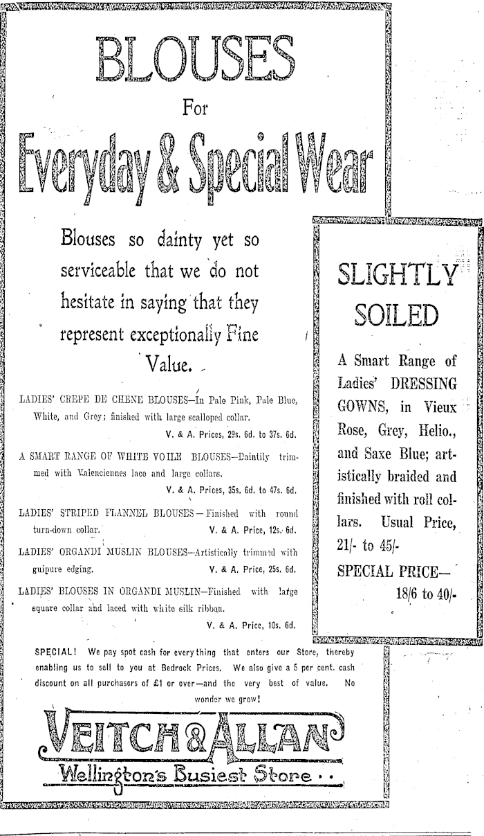 || i ji * • For . i ; " I * [j i I Blouses so dainty yet so | 1 I serviceable that we do not } SLIGHTLY hesitate in saying that they I tt\ * j represent exceptionally hne /I .5 I ' Value* I Smart Range of I I \ I Ladies' DRESSING ( \ LADIES , CEEPB DE CHE.N T E BLOUSES-In Pale Pink, Pale Blue, 1 rnva-Kio ■ \t- "' : ! i ■ -. L I GOWNS, in Vieux ■ 1 I White, and Grey; finished witk large scalloped collar. gL i 'I . v. &a. prices, 295. 6d. to 375. 6d. | Rose, Grey, Helio., J I A SMART RANGE OF WHITE VOILE BLOUSES-Daintily trim- jj Slid Saxe Blue; art- | S med with talencieimes lace and large collars. | isticallv braided and t I V. &A. Prices, 355. 6d. to 475. 6d. I -~,.,, „ , I :i \ nnished with roll col- \ I LADIES' STRIPED FLANNEL BLOUSES-Finished with round I _ . I I turndown collar.' V. &A. Price, 12s, 6d. I »"*- UsUal PriCe > | f LADIES' OBGANDI' MUSLIN BLOUSES-Artisticnlly trimmed with \ tO 45/- | •i guipure edging. V. &A. Price, 255. 6d. \ SPECIAL PRICE— ' I LADIES' BLOUSES IN ORGANDI MUSLIN-Finished with | Jg/g fo 40/. j I ' square collar and laced with white silk ribbon. & , ' ! ! ■ ' V. &A. Price, 10s. 6d. | | = SPECIAL! We pay spot cash for everything that enters our Store, thereby j| .. ..-—-...-■ £ enabling us to sell to you at Bedrock Prices, We also give a 5 per cent, cash f I ' discount on all purchasers of £1 or over—and the very best of value. No | i ■ , wonrisr we grow! | ' 1 Wellireffioß's Busiest »« , 1.. : I u _ _;_ b