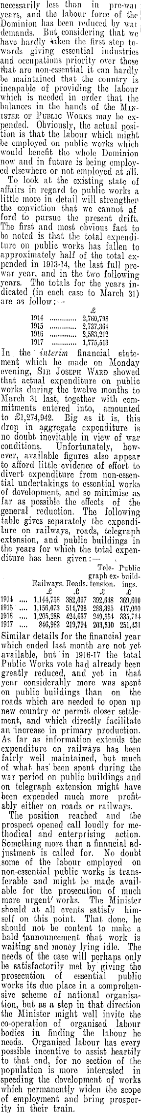 necessarily less than in pro-wai years, and the labour force of the Dominion has been reduced by ivai demands. But considering that we have hardly Vrken the first step towards giving essential industries ancl occupations priority over those tihafc are non-essential it can hardly be maintained that the country is incapable of providing the labour which is needed in order that the balances in the hands of the Minister of Public Works may bo expended. Obviously, the actual position is that the labour which might be employed on public works which would benefit tho whole Dominion now and in future is being employed elsewhere or not employed at all. To. look at the existing state of affairs in regard to public works a little more in detail will strengthen the conviction that we cannot af ford to pursue the present drift. The first and most obvious fact to be noted is that the total expenditure on public works has fallen to approximately half of the total expended in 1913-14, the last full prewar year, and in the two following years. The totals for the years indicated (in each case to March 31) are as following 15)14 2,7ti0,T08 1915 2,737,364 1916 2,583,212 1917 1,775,513 In the interim financial statement which he made on Monday evening, Sir Joseph Ward showed that actual expenditure on public works during the twelve months to March 31 last, together with commitments entered into, amounted to £1,274,942. Big as it is, this drop in aggregate expenditure is no doubt inevitable in view of war conditions. Unfortunately, however, available figures also appear to afford little evidence of effort to divert expenditure from non-essen-tial undertakings to essential works of development, and so minimise as far as possible the effects of tho general _ reduction. The following table gives separately tho expenditure on railways, roads, telegraph extension, and public buildings in the years for which the total expenditure has been given: — Tele- Public graph ox- buildRailways. Roads, tension, ings. «£ 1914 .... 1,144,756 382,097 392,648 369,600 1915 .... 1,156,073 514,798 288,395 417,000. 1916 1,205,288 424,637 249,554 335,714 1917 .... 846,983 219,794 203,310 251,431 Similar details for the financial year which ended last month are not yet available, but in 1916-17 the total Public Works vote had already been greatly reduced, and yet in that year considerably more was spent on public buildings than on the roads which are needed to open up new country or permit closer settlement, and which directly facilitate an 'increase in primary production. As far as information extends the expenditure on railways has been fairly well maintained, but much of what has' been spent during the war period on public buildings and on telegraph extension might have been expended much more profitably either on. roads or railways. The position reached' and the prospect opened call loudly for methodical and enterprising a.ction. Something more than a financial adjustment is called for. No doubt some of the labour employed on non-essential public works is transferable and might be made available for the prosecution of much more urgent' works. The Minister should at all events satisfy himself on this point. That done, he should not be content to make abald_ fihat work is waiting and money lying idle. The needs of the case will perhaps only be satisfactorily met by giving tho prosecution of essential public works its due place in a comprehensive scheme of national organisation, but a,s a step in that direction tho Minister might Avell invite the co-operation of_ organised labour bodies in finding the labour he needs. Organised labour has every possible incentive to assist heartily to that end, for no section of the population is more interested in speeding the development of works which permanently widen the scope of employment and bring prosperity in their train.