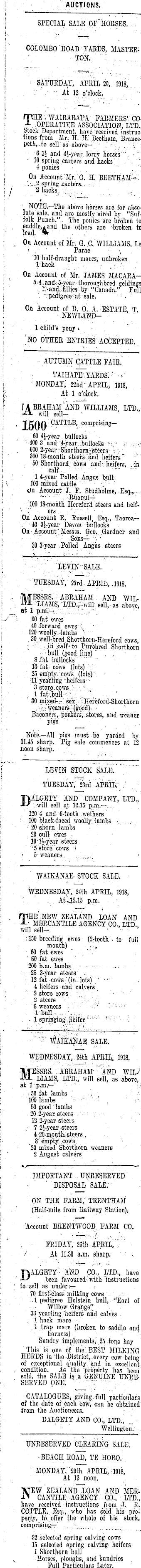 i AUCTIONS, J SPECIAL SALE OF nORSES. . -. i COLOMBO ROAD YAEDS, MASTER; j TON. .. .. I SATURDAY, APRIL 20,. 1918, I .. V ' •'. 4.1 12 o'clock. . ■ I ... '.— : "■.•-. . ..; ! mHE '. WAIRARAPA FARMERS' COif- .OPERATIVE ASSOCIATION, LTD., : Stock Department, have reecived instruc- : tions from Mr. H.H.' Beetham, BranceI peth, to eellas above— "■'...:":■'."•. ;' ! ■ '6 3J- and 4J-year, lorry horses'"'. • ' i ■ 10 spring carters and hacks' '■ ■ . '" : i ponies ■ '"'."' : On Account Mri O. H. BEETHAM-: ! .'.-.:.2 spring carters,. ..: ; j "2 hacks.,-,•....'.., . : , . . , ' NOTE.—The above horses are for abso- : lute sale, and are mostly sired by "Suffolk Punch.". The ponies are broken to ; . eaddle.jaud the others aro broken to r lead. » ....--.. ; , On Account of Mr. G. C, WILLIAMS, L'e |- .'.■■■ Parae ■■ \ ' 10 half-draught mares, unbroken ! I , hack ■ ■ .-'. - . . .--, j On Account of Mr. JAMES MAC.ARA- ; 5,4,and«5-year thoroughbred geldings : : :'--ani;fillie3 :by "Canada." Full ! '. "pedigree-'nt sale. : ■ ' I On Account of D. 0.. A..ESTATE T. ■ : NEWLAND- ; 1 child's pony i - - . J 'NO OTHER ENTEIES 1 ACCEPTED. ! ; - AUTUMN CATTLE FAIR,' " I .'.;.■ TAIHAPE'-YAEDS. ' .' |. MONDAY, 22nd APRIL, 1918, j'.... At 1 o'clock. f fABEAHAM v AND WILLIAMS LTD., i ■«- will sell- ' ; , 15QQ CATTLE, comprisingi 60 45-year bullocks I '" 400 3 and 4-year..bullocks -- ■' ;■ -.-..^ i. . 600 2-year:Shorthorn>iteers■ r.' . ! 300 18-month steers and heifers " I 50 Shorthorn "cows "dud-heifers, in i ' calf-. : ."'■■■. '■'• i ; ■ 1 4-year Polled-Angus bull j \ 100 mixed cattle '■' -.' ■'- i On Account J. F. Studholme,-Esq.,.-. ! ' ~-'- ■-"' , -Ruanui— ! 100 18-month Herefcrd steers and heiv , - ; '■':'' -. er3 .. . :: :.---.'. ■ • ' Oβ Accounfi B, Russell, Esq., Taoroa— j '..' •40 31-year Devon bullocks . I On ■ Account:'.. Messrs. G.eo., Gardner and i. . ■ • ." - .Sons-T "i ■ ; . 30 3-year ..Polled. Angus eteers ! •■- ' "LEVIN'SALE. I . TUESDAY; 23rd. APRIL, .1918. MESSRS. ABRAHAM. AND WIL■LIAMS, • LTD-Fwill" eell, as above, i at 1p.ni.H.'..;....-'..,'. 60 fat ewes :. 40ionvard ewes : ■ I 120 woolly, lambs ■ i . 30. wellrbred. Shorthorn-Hereford cows, j . -•■': ..in ;i;alf'to Purebred Shorthorn !. -• bull-(good-line) . ; . 8 fat ; bullocks" ' "." ' !' 10 fat- cows (lots) '-.' ! 25 empty-'cows (lots) , . I .. 11 yearling ".heifers ■"- 3 store.cows ' ■ ■ ; . 1 fat{buH-.\':". "■'. • ' ; ' 30 m&et-". sex.-'-'Hereford-Shortliorn j : -;;;■ weariere.'-j[good)..'' 1 .Baconei ; s,.-p6rkei , s7 stores, and weaner ! ' Piss " ' . ... i Note.—All pigs must be yarded by I 11.45 sharp. Pig sale commences at 12 ; noon sharp. ! LEVIN STOCK SALE.'"""" ■ TUESDAY, 2'3rd APRILV / TYALGETY AND COMPANY, LTD., : -tf '.-will sell at 12.15 p.m.—. ... : 120 ' i and C-tooth'■.Where ' ■'■ '- 100 black-faced woolly, lambs -. .... ■ 1 -20 shorn lamb 3 ■ ■ " i 20 cull ewes : ;.' IOIJ-jear steers !. : S'sfbfe : cows 'i ; ■ 5-weaners.. ..,.,.... J WAIEANAE STOCK SALE. ■ i WEDNESDAY, 24th APRIL, 1918, ■ "... ... At 42.15 p.m. THE. NEW ZEALAND. LOAN AND MERCANTILE AGENCY CO., LTD. ; will.sell-T-, . .. . • ; 150 breeding ewes (Smooth ■ to full mouti) . -:,' 1 60 fat ewes j ' 60 fat ewes ! 200 b.m. lambs ' • . 25 3-year steers' . ; 12 fat-cows ; '(ia-lots) '■'' .. 4 Keifers and. calvers 2 store cows • '. • ' : ■' 2 steers "-.".. -.'■.■ '.',. '6 weanors '-" •'•"• .-!-' 1 - , -'- 1 ' ■l-.bii11,,.....-.,.,.. . - 1 springing",Eeifer , "'''' '"•■■:. '■■ ■'. ! ■' ' : ''' WAiKAfrAE SALE. : WEDNESDAY, ,24th APEIL,. 1918, M' ESSRS. . ABRAHAM' "AND WIL- , LIAMS, LTD., will sell, as above, : at 1 ■p.m.'— ■ ': ..- : .50 fat Jambs .. : ••'■ : 100 lambs •' - ; " : . ' .-'■ : 50 good' lambs 1 . 202-year steers .-; : 12 2-year steers ■ ! - 7 21-year .eteers j 4. M-nipiitKi:steers., !■ . 8' empty: .cows. : 20 mixed STiorthorn weaners ■ ' 2 August calvers ; • IMPORTANT ..UNRESERVED' i • ' ' DISPOSAL SALE; i ON THE FAR3I; TRENTHAM [ (Half-mile from Railway Station). \ Account BRENTWOOD FARM CO. i • • ——.'•. -7 -. .".. I . FEIDAY, 26th APEli,r, ; / At 11.30 a.m. sharp. ' ' , D ALGETY ■ AND CO., LTD., have : . been favoured'with instructions i ' to.sell as under:— 70 first-class milking cows . ,:• i . 1 pedigree Holstein-bull,. "Earl of 1 • ■ AVillow Grange" . ; 33 yearling heifers and calves . i .. ' 1 hack mare i .1 trap mare (broken to saddle and ! harness) • : i Sundry implements, -25 tons hay ', This is one of the'. BEST MILKING i HERDS in'tho District,-every cow being ; of exceptional quality, and in excellent ; . condition. As tlio property lias been sold, the SALE is a GENUINE UNRE- ■ . ' SERVED ONE. " ;. :' ' ' .. ' : \ CATALOGUES* giving. Ml particular's of the date of each cow,- can be obtained : from the Auctioneers. - -:. i DALGETY AND CO., LTD., '_. '■ Wellington. .... \ UNRESERVED CLEARING SALE. • BEACH ROAD, TE HORO.I ' MONDAY,"29th APRIL, r 1918, ; . At 13 noon. NEW ZEALAND -LOAN AND MERCANTILE AGENCY. CO., LTD., : have received instructions froni J. R. I C.Q'ITLE,. Esq., who has sold' his property, to. offer the whole of his 6tock, comprising—! . ..-. j . 32 selected epi'ing calving cows ! 15 selected spring calving) heifers 1 Shorthorn bull ' v Horses, ploDghs,. and'sundries I Full Particulars Later.