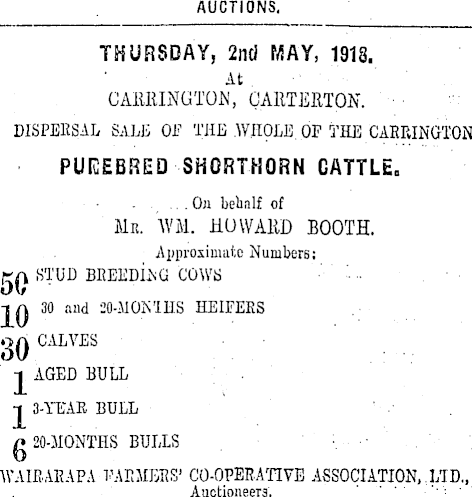 AUCTIONS, THURSDAY, 2nd MAY, 1918. At CAIIRLNGTON, CAIITMTON. DISPERSAL SALE OF THE WHOLE. OF THE CARRINGTON PUREBRED SHORTHORN CATTLE. - ... On behalf of Mr. AVM. HOVVAItD BOOTH. Approximate Numbers: jrA STUD BREEDING COWS •' •■■ . ■ • -«a 30 and 20-MOK'IHS HEIFERS OA CALVES ■I AGED BULL . ■I 3-YEAR BULL n 20-MONTHS BULLS ■ ■ ■■ ' . O WAIRARAPA FARMERS , CO-OPERATIVE ASSOCIATION,.LTD., Auctioneers. ' ' ' ' ■ '