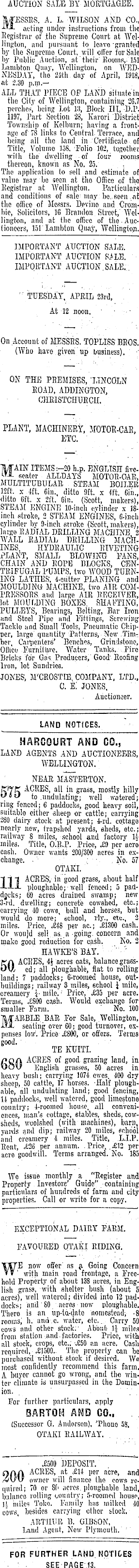 AUCTION SALE BY MORTGAGEE. MESSES. A. L. WILSON AND CO., acting under instructions from the Registrar of the Supreme Court at Wellington, and pursuant to leave -granted by the Supremo Court, will offer for Sale by Public Auction, at their' Rooms,. 151 Limbton Quay, Wellington, on WEDNESDAY, the 21th. day of April, 1918, at 2.30 p.m.— ALL THAT PIECE OF LAND situatcin the City of Wellington, containing 20,7 perches, being Lot 13, Block 111, D.l'. 1197, Part Section 23, Karori District Township of Kelburn; having a frontage of 7S links to Central Terrace, and being all the land in Certificate, of Title, Volume 158, Folio 102, together with the dwelling .of four rooms thereon, known as No. 25. . . The application to sell and estimate of value may be seen at tlio Office of the Registrar at Wellington. Particulars and conditions of sale : may bo..seen.-at the office of Messrs. D.evino and Crombie, Solicitors, 1G Brandon. Street,' Wellington, and at the office of the Auctioneers, 151' Lambton Quay, Wellington. IMPORTANT AUCTION SALE. IMPORTANT AUCTION SiLE. IMPORTANT AUCTION .SALE,:. " TUESDAY. APRIL 23rd, . At 12 noon. ' • ■• • On Account of MESSRS. TOPLISS BROS. (Who have given up business). ON THE PREMISES, 'LINCOLN ROAD, ADDINGTON, CHRISTCHURCH. PLANT, MACHINERY, MOTOR-CAE, ETC. ' . . MAIN ITEMS :-20 h.p. ENGLISH fiveseater ALLDAYS MOTOR-OAR, MULTITUBULAR STEAM BOILER 12ft. x 4ft. din., ditto 9ft. s 4ft. Gin., ditto Gft. x 2ft. Gin. (Scott, makers), STEAM ENGINE 10-inch cylinder x 18inch stroke, 2 STEAM ENGINES, fi-inch cylinder by 9-inch stroke (Scott, makers), large RADIAL DRILLING MACHINE 2 WALL RADIAL DRILLING MACHINES, HYDRAULIC RIVETING PLANT, SMALL BLOWING FANS, CHAIN AND ROPE BLOCKS, CENTRIFUGAL I'UMPS, two WOOD TURNING LATHES, 4-outter PLANING and MOULDING MACHINE, two AIR COMPRESSORS, and large AIR RECEIVER, lot MOULDING BOXES SHAbTING, PULLEYS, Bearings, Belting, Bar Iron and Steel Pipe and Fittings, Screwing Tackle and Small Tools, Pneumatic Chipper, large' quantity Patterns, Now .Timber, Carpenters' Benches, Grindstone, Ollicu Furniltore, Water Tanks,.--.. Fire Bricks for Gas. Producers,' Good' Roofing Iron, lot Sundries. JONES , , M'CROSTIE, COMPANY, LTD., C. E: JONES. Auctioneer. LAND NOTICES. HARCOURT AND CO., LAND AGENTS AND AUCTIONEERS, WELLINGTON. NEAR MASTERTON. RWK ACRES, all in grass, mostly hilly y>O to .undulating; well watered; ring fenced; 6 paddocks, good heavy soil, suitable either sheep or cattle; carrying 380 daily stock at present; 4-rd. cottage nearly new, trapshed yards, sheds, etc.; railway 8 miles, school and factory H miles. Title, O.R.P. Price, £9 per acre cash. Owner wants 200/300 acres in exchange. ■' / ■•. No. 57 OTAKI. m ACRES', in good grass, about half ploughable; well fenced; 5 paddocks; 60 acres drained swamp; new 3-rd. dwelling; concrete cowshed, etc.; carrying -10 cows, bull and horses, but would do more; school, rly., etc., 2 miles. Price, MS per ac; JSI3OO cash. Or wou]d sell..as. a going, concern and. make good reduction for cash. No. 2 HAWKE'SBAY. - : '"-' £A ACRES, 41 acres oats, balance grassOv, ed; all ploug'aable, flat to rolling land; 7 paddocks; G-roomed house, outbuildings; railway 8 miles, school { mile, creamery f mile. •' Price, .£35 per acre. Terms, >£SOO cash. Would exchange for smaller Farm. ' No. 100 MARBLE. BAR For Sale, Wellington, seating over GO; good turnover, expenses low. Price .£BOO, or offers. Terms good. ' ■ ■ . . '■• TE KUITI. PDA ACRES of good grazing land, in 1301/ English grasses, SO acres in. heavy bush; carrying 1074 ewes. 400 dry sheep, 50 cattle, 17 horses. Half ploughable, all undulating land; good fencing, 14 paddocks, well watered, good limestone country; 4-roomed house, all conveniences, man's cottage, stables, shede, cowsheds, woolshed (ivith machines), barn, yards and dip; railway 20 miles, school and creamery 4 miles. Title, L.I.P. Rent, >£2<> per annum. . Price, . j>l2 per acre goodwill. Terms arranged. No. 185 Wo issue monthly a "Register and Property Investors' Guide" containing , particulars of hundreds of farm and city properties. Call or write for a copy. EXCEPTIONAL DAIRY FARM. FAVOURED OTAKI RIDING. WE now offer as a. Going Concern with main road frontage, a Freehold Property of about 138 (icres. in English grass, with shelter bush (about 5 acres), well watered; divided into 12 paddocks; and '80 acres ■ now ploughable. There is an up-ta-dato nomestead; -8 rooms, h. and-.c. water, etc.. Carry 50 cows and other stock.' About miles from station .and-factories. Price, with all stock, crops, etc.; vESO an acre. Cash required, ,£1500.. The property can be purchased without stock if desired. Wn most confidently recommend this farm. A buyer cannot go wrong, and tho wintor climate is unsurpassed in the Dominion. ' ... For further particulars, apply BARTON AND GO.. (Successor G. Anderson), 'Phono 58, OTAKI RAILWAY. ■ iiifl'O DEPOSIT. ~ QAA ACRES, at £U per acre, and A\j\J owner will finance the cow 9 required; 70 or 80 acres, ploughable land, balance rolling country; 5-roomed house, 1J miles Toko. Family hits milked 40 cows, besides carrying other stock. ARTHUR B. GIBSON, Land Agent, New Plymouth. ' FOR FURTHER LAND. NOTICES SEE-PAGE.I 3.