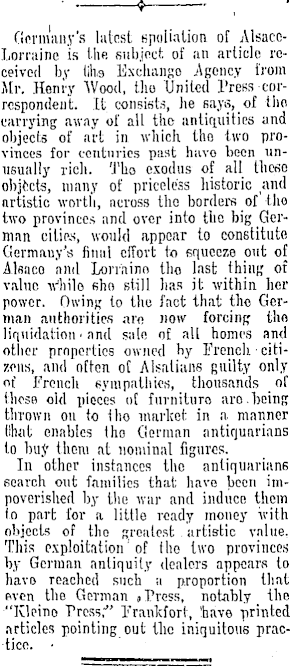 Cicrmany's latest Hpiilinlioti of AlsaceLorraine is l-he subject of an article received by iiha Exchange- -Agency from Mr. Henry Wood, the United Press-cor-respondent. It. consists, he says, _of tho carrying away of all the antiquities and objects of art in which tho two provinces for centuries past Imvo been unusually rich. Tho exodus of all these objects, many of priceless historic and artistic worth, across the borders of tlio two provinces and over into tlie big German citie.s, would appear to constitute Germauy's final effort to squeeze out of Alsaco and Lorraino tho last thing of value winio fiho still has it within her power. Owing to tho fact that the German authorities am now forcing tho liquidation'and sale of all homes and other properties owned by French ■ citizens, and often ot Alsatians guilty only of French sympathies, thousands of those old pieces ot furniture- are-.being thrown on to iho market in a manner tlhat enables tho German antiquarians to buy them at nominal figures. In other instances tho antiquariane search out families that; have been impoverished by the war and induce them to part for a little ready money irith objects of tho greatest . artistic value. This exploitation' of ihe two provinces by German antiquity dealers appears to havo reached such a proportion that M-en the German »Press, notably the "Kleino Press, - " TraiiWorl, 'have printed articles pointing out tlic iniquitous practice. •
