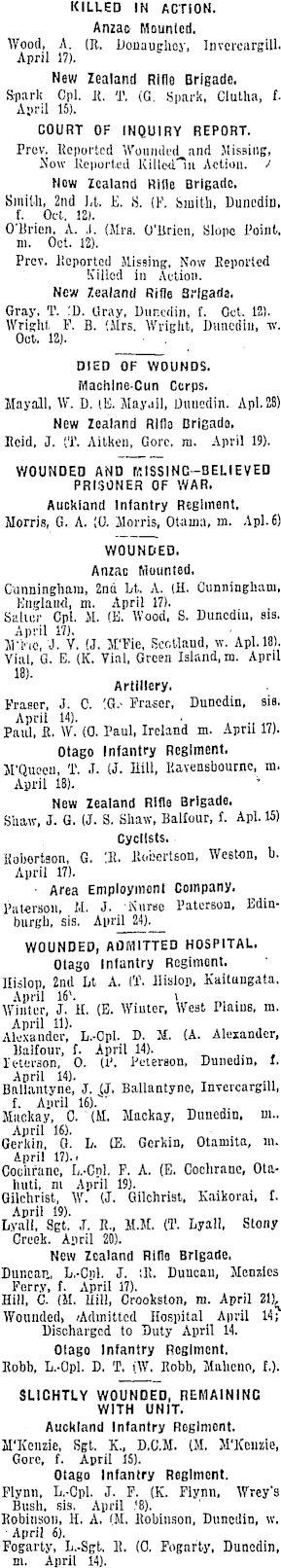 KILLED IN ACTION. Anzac Mounted. Wood, A. (E. Donaughcy, Invcrcargill. April 17). New Zealand Rifle Brigade. Spark Cpl. J{. T. (G. Spark, Clutha, f. April 15). COURT OF INQUIRY REPORT. Prev. Reported Wounded and Missing, Now Reported Killcdin Action. ) New Zealand Rifle Brigade. Smith, 2nd l,t. E. ,S. (F. femith, Duncdin, f. Oft. 12). O'Brien, A. .1. (Mrs. O'llrien, Slope Point, m. Oct. 12). Prev. Reported Missing, Now Reported Killed in Action. New Zealand Rifle Brigade, Gray, T. :D. Gray, Duncdin, f. Oct. 12). Wright P. B. (Mrs. Wright, Duncdin, w. Oct. 12). ■ . DIED OF WOUNDS. Machlne-Cun Corps. Mayall, W. D. lli. llayall, Dimedin. Apl. 28) New Zealand Rlfio Drigade. Reid, J. IT. Aitkeu, Gore, m. April 19). WOUNDED AND KISSINC-BELIEVED PRISONER OF WAR. Auckland Infantry Regiment. Morris, G. A. ;O. Morris, Otama, m. Apl. 6) WOUNDED. Anzac Mounted, Cunningham, 2nd Lt. A. IH. Cunningham, England, m. April 17). Sailer Cpl. M. !E. Wood, S. Duncdiu, sis. iri'le! J. Y. !J. M'Fie, Scotland, w. Apl. 18). Vial, G. E. (K. Vial, Green Island, m. April 18). Artillery. Frascr, J. C. (G.- Fra-ser, Dunedin, sie. April 14). - . , Paul, E. W. (0. Paul, Ireland m. April 17). Otago Infantry Regiment. M'Queeu, T. J. (J. Hill, Kavensbourne, m. April 18). '- New Zealand Rifle Brigade. Shaw, J. G. (J. S. Shaw, Balfour, f. Apl. 15) Cyclists. Robertson, G. !E. Robertson, Weston, b. April 17). ■ Area Employment Company. l'atersoM, M. J. Kurue Paterson, Edinburgh, sis. April 24). WOUNDED, ADMITTED HOSPITAL. Otago Infantry Regiment. Ilislop, 2nd Lt A. IT. Hislop, Kaitungata, April 16 , . i „, . Winter, J. H. (E. Winter, West Plains, m. April 11). Alexander, L.-Cpl. D. M. (A. Alexander, Balfour, f. April 14). retcraon, 0. U , . Peterson, Dunedin, f. April 14). Ballantyne, J. (J, Ballantyne, Invercargill, f. April 16).""' Mackay, 0. (M. Mackay, Duncdin, in.. April 16). Gerkin, G. L. lE. Gerkin, Otamita, in. April 17).. Cochrane, L.-Cnl. F. A. (E. Cochrane, Otahuti, ni April 19). Gilchrist, W. (J. Gilchrist, Kaikorai, I. April 19). Lyall, Sgt. J. R., M.M. (T. Lyall, Stony Creek. April 20). New Zealand Riflo Brigade, Duncan, L.-Cnl. J. ;R. Duncan, Mcnzics Ferry, f. April 17). Hill, C. (M. Hill, Orookston, m. April 211 Wounded, /Admitted Hospital April 14? Discharged to Duty April 14. Otago Infantry Regiment. Eobb, L.-Opl. D. T. iW. Robb, Mahcno, f.). SLICHTLY WOUNDED, REMAININC WITH UNIT. Auckland Infantry Regiment. M'Kenzie, Sgt. K., D.C.M. (M. M'Keuzie, Gore, f. April 15). Otago Infantry Regiment. Flynn, L.-Cpl. J. F. (K. Flynn, Wrey's Bush. sis. April .'8). Robinson, H. A. (M. Robinson, Duncdin, w. April 6). Fogarty, L.-Sgt. R. (0. Fogarty, Dunedin, m. April 14).