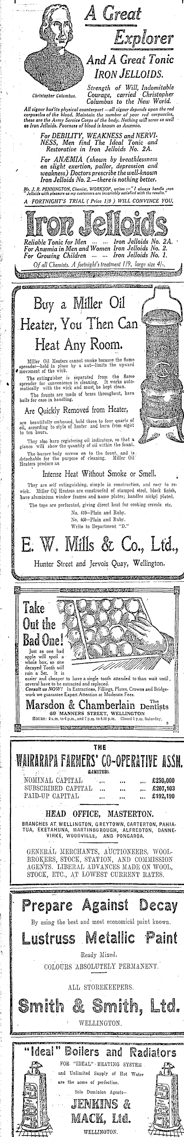i '■ '£§&&& And A Great Tonic j IronJelloids. . ■ ' Strength of Will, Indomitable ■ ■ Christopher Columbus, Courage, carried Christopher \ Columbus to the New World. . ; All Vigour has'its physical counterpart —all vigour depends upon the red : corpuschi of the blood. Maintain the number of your red corpuscles, j these are the Army Service Corps of the body. Nothing will serve so well ■ i at Iron Jelloids, Poorness of blood is known as Anxmia. ; For DEBILITY, WEAKNESS andNERVI. I . . . NESS, Men find The Ideal Tonic and ; : Restorative in Iron Jelloids No. 2A. ; . For ANMMIA (shown by breathlessness on slight exertion, pallor, depression and weakness) Doctors prescribe the well-known ; Iron Jelloids No. 2.—there is nothing better. '' Mr. J. R. PENNINGTON. Chemist, WORKSOP, writes .—"/ aluiayt handl* ,ron I Jclloidi with pltature at my cmlamers are invariably talisfied with the results." ' A FORTNIGHT'S TRIAL (Price 1/9), WILL CONVINCE YOU, \: Reliable Tonic for Men - - Iron Jelloids No. 2A. • ! For Ansemia in Men and Women Iron Jelloids No. 2. (i For Growing Children — - Iron Jelloids No. 1. ' 1 Of all Chemists. A fortnight's treatment 119, large size 41-'. I ;T Buy a Miller Oil ■'■[ ] r, . Heater You Then Can ■ * \\ Heat Any Room. H| '■ Miller Oil Heaters cannot smoke because the flame l^f'^^ffiM : spreader-held in place by a nut-limits the upward ' , * movement of the wick. I^^yW^^l The extinguisher is separated from the flame Ji-bft^ffl. '" » spreader for convenience in cleaning. It works auto- /^K^M^^k matically with the wick and must be kept clean. W^%^P^^ The founts are made of brass throughout, have || I^eaa^r *' -^m^ i. bails for ease in handling, ,^5 -^^^ I. Arc Quickly Removed from Heater, '-' are beautifully embossed, hold three to four quarts of :. oil, according to style of heater, and Lurn from eignt l^«ttaifiagS^f| ■ They also have registering oil indicators, so that a '*"sftjj£§ ' glance 'will show tho quantity of oil within the fount. ' The '-burner body screws on to the fount, ajid is; detachable for the purpose of cleaning. Miller Oil' \ Heaters produce an ; Intense Heat Without Smoke or Smell, ii j • : They are self extinguishing, simple in construction, and easy lo rewick. Miller Oil Heateie aro constructed of stamped steel, black finish, '. nave aluminium window frames and name plates;, handles nick.el plated. '■■ ;' The tops are perforated, giving direct lieat for cooking cereals etc. ; ' No. 410—Plain and Ruby. ' No. 460-Plaia and Ruby. ! .. Write to Department "D." ETWT H W*ii © Tr i •■■ \a/ \/S<llc Kt I a 8 Trt ♦ W« IVIIIIS. OL L^lU^ k Hunter Street and Jervois Quay, Wellington. ■ whole tox,'so one '''sssssssmssvmssj/j ' ■ decayed Tooth will 'tylii?jwy//jw s ' . i ■ ruin a Set. It is i • easier and cheaper to have a single tooth attended to than wait until, ' several have to be extracted and replaced. ', Consult us NOW! In Extractions, Fillings, Plates, Crowns and Bridgework we guarantee Expert Attention at Moderate Fees. Marsdon & Chamberlain Dentists ; 69' MANNERS STREET, WELLINGTON ■ HOURS: 8a.m.t06 p.m.,and7p.m.t08.30 p.m. Closed 1 p.m. Saturday. THE [ llilflfilEßS , CWPEIITIIE M. ■■[ ,:■■■: .-:■■ (LIMITED). NOMINAL CAPITAL ■... ... ... £250,000 SUBSCRIBED CAPITAL £207,103 ; PAID-UP CAPITAL ... ~, ... £192,190 HEAD OFFICE, MASTERTON. ; BRANCHES AT. WELLINGTON, GREYTOWN, CARTERTON, PAHIA- ■ I TUA, EKETAH.UNA, MARTINBOROUGH, ALFREDTON, DANNEVIRKE, WOODVILLE, AND PONGAROA. • GENERAL MERCHANTS, AUCTIONEERS, WOOL- >, BROKERS, STOCK, STATION, AND COMMISSION : ' AGENTS. LIBERAL ADVANCES MADE ON WOOL, i STOCK, ETC., AT LOWEST CURRENT RATES. I By using tlie best and most economical paint known. I Lustruss .Metallic -Paint. ?v Ready Mixed, : COLOURS ABSOLUTELY PERMANENT.' ALL STOREKEEPERS. ! . ' WELLINGTON. \ I "Idea!" Boilers and Radiators pK FOK "IDEAL" • HEATING SYSTEM . PK i -AsLabjj ' and Unlimited Supply of Hot Water jAHbSf! ar» the acme of perfection. || ; ,}m 3 ||i S* 3 ' o Dominion Agent 3— ||S |J ' '*7z£K3!lXr WELLINGTON. V^X^^^