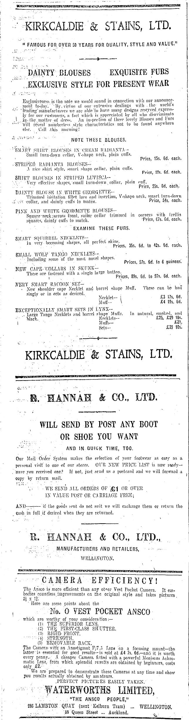i ■ " -V-VOVC A T FiTU Sir CT A TtVfQ TTH i ...■-..•■■.. " FAMOUS FOR OVER GO YEARS FOR QUALITY, STYLE AND VALUE," I '"';;' U DAINTT. BLOUSES . EXQUISITE FURS :' /, " ...MCLUSIVE. STYLE FOR PRESENT WEAR ; i Exi'li.iHivPiioss is tho nfilo wo would sound in connection wjlli our annou.icei . )iient Ip'-iliiy".' 'By, virlnii nl' ourextensive dealings with .the worlds '•'- 1 ' , l(ia(li'iig i iiiiVfnif < icl.iiivw wo me altln'lo have many dpsSjfiw reserved, rxnrcss- , ly f(ir our nwtomwK, n fuel which is appreciated by all who dismminato i ..I .in-(ho mailer-of dress. An iiisprcl.iim of tlnvn lovely Mouses and l'.ir.s ""'"' Ivill rcvenl .slylu chariicterislics not to bo i'uuntl anywlicro else. . Cull .this muriiiiig! £: siit-z-M , ... - NOTE THESE BLOUSES. ■'SMART fi|J.II!T.-.l',l,oi!St:s.lN GIIHAM KAI)IANTA- : 'Siuiill lurn-dowti cellar, V-shiipo ntcli, plain culls. Price, 15s, 6d. each, - STVMi'EI'i KADI A NTA HJ.OIiSESA nice shirt style, smart shape collar, plain culls, j Fricc, 19s. 6tl. each. STII.UT HLOWSIvS IN , STIIIITO LUVISCA- ' ■■■'•.■•" Vury ell'cclivc' shapes,'«in»ll turn-down, collar, plain cu/T. ::■;■.. . ■ ' Prion, 255. Gd, each. : DAINTY ItLOCSH L\ 7 WHITE C.KORCiKT'I'J?--'I'riiniiiod iiiiil.at.ion fillft. Inc.; mid inscrliou, V-slmpo neck, smart liirn-dowii :' •.■■■■( eoilar, and rfninfy cuffs (o nialcii. Price, 545. each. ' PINK AND - WIUTC 'GIiOROK'JTB BLOUSES- . Sniiara-neck-aeiw.s front, railor cullnr (rimmed in comer.' Willi Ivpllis squiite, dainty cuffs to match. 'Price, 675. Gtl. oach. ; ■■■'" EXAMINE THESE FURS. : , Jn very- becoming -shape,, all perfect SMALL AVO'LV TANGO MK.'KLJi'J'S-. ;•• lnclu.lil.jr mm of the mo.n novel ..hnpe.. & ■ - NEW CAT'E.'COLLARS IN SKUNK- ~, Thee .re fastened with a ringlo large IVEBY fiMART RACOON SET- ' . ■. • New shoulder wipn Necklet iind- barrel shape Sfnfl. I heso cini be linu : singly of in fide as desired., ~,,,; f1 17t firt iSccklol. — . S3 17s. 6a, ' . , Muff- \ £4 19s. 6ri, EXCEPTIONALLY ISMART SETS IN LYNX- . LarßO Tango Necklets ami barrel flinpe Mulls. In natural, smnl;e;l. nml -■■■ Wack. ■ Nock lots- £24, £29 10s. I ' Muffs- i 2). ' .. Sets- £39 10s. KIRKCALDIE & STAINS, LTD, ~.!,,8.' : MANNAH & CO., LID. WILL SEND BY POST ANY BOOT OR SHOE YOU WANT ■'" ■'■":".-..: ,- AND IN QUIUK TIME, TOO. Our Mail Order System makes the selection of your footwear as easy as ;v personal visit to one of our stores. OUR. NEW I'KICK LIST is now ready— , nave you received one? If not, just sciid us a postcard and we will fortnml a copy by return mail. .' '""'■,• •■ WE SEND ALL ORDERS OF £\ OR OVER, IN VALUE■ POST OK CARRIAGE FREE; AND —^γ —if the goods tout do not suit wo will exchange them or return tho (jash in full if desired when they are returned. ' K. HANNAH & CO., LTD., ' , ,'::.:;/ ;■;' . manufacturers and retailers, •••■• ■" ''■■ '"•■■' WELLLVCri'ON. • - ■•■■• ■■ : .C A M : E R A E F FICIE NcYi The Ansco is more efficient than any Vest Pocket Camera. It cmboefies'cotntless iraprovsmenti on the original style and takes pictures 21 x If: ■ ' Here are sonie point? about the , , : No. 0 VEST POCKET ANSCO- . which are worthy of your considers tion :— (1). THE STOI'ItIOR. LENS. (2) THIJi FIRST-CLASS SHUTTER. (,:i) RfGiD-FRONT. ■■•- ■■ M-l) STR.B.NT4TH. (a) REMOVABLE BACK. The Camera), with'an Annstigmat P/7..") Lens on a focusing mount—tho latter "inessential- for (food results— is sold at £4 7s, 6d.—nntii it is worth every penny,. A cheaper Camera ftt.twl with a powerful Meniscus Achromatic Lera, from which splendid results are obtained by beginners costs only £Z. : We are prepared to demonstrate these Cameras at any time and show you Tesults actually obtained by am a-tenra. .PERFECT PICTURES EASILY TAKEN." - '-'■■; \ ■■:■'■ f ATEKWORTIS LIMITED, : . ;.'.■;. ... "THE ANSCO PEOPLE," ; 286 LAMBTON QUAY (next'Kelburn Tram) ... WELLINGTON. : ... . "68 Queen Street ... Auckland. „ . 1 I—i'lilMWlPHWllllWll I WIIMUMiII lIMIWia ■! ■■Him !■ ■■■■■■mil '