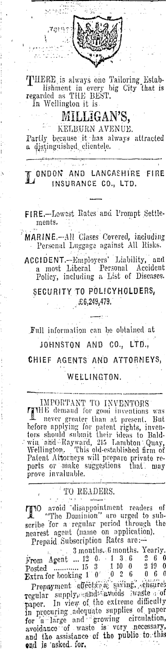 ■ 'J'HERE.is always one TailoringEstab- : lisKment in every big City 'that is regarded as THE BEST. In Wellington it is , ■■■■-■ MiLLIGAN'S, ■ :, KELBUIiN AVENUE. ; Partly because it has always attracted 1 a distinguished., clientele. * T ONDON* AND LANCASHIRE FIRE I **i INSURANCE CO., LTD. FlßE.—Lowest Bates and l'rompt .Settle-■ ■ ments. ■ ' . 'MARINE.—.AII Closes Covered, including : - Personal Luggaga against All ltisks. ACClDENT.—Employers' Liability, ami a most Liberal Personal Accident Policy, including a List of Disease.?. SECURITY TO POLICYHOLDERS, , £6,249,479. Full information can be obtained at JOHNSTON AND CO., LTD., ■ CHIEF AGENTS AND ATTORNEYS, | : WELLINGTON. : IMPORTANT TO INVENI'OJIS TUB demand For gomi inventions was never greater tlian at present. But beforo applying for patent rights, inventors should submit their ideas to Bald- •' win and -Hay ward, 215 T.nmbton' Quay, Wellington.. This old-est.ibliahed firm of, : Patent Attorneys willprepnro private re- ' ports or -make suggestions that, may prove invaluable. . .■ '' TO BEADEHS. TO avoid "disappointment readers of "Tho Dominion" aro urged to subscribe for a regular period through tho nearest ngent (naino on application). : Prepaid.Subscription Rates aro:— • .- . 3months..(imonths. Yoariy. From Agent ... 12 0. 1 3 6 2 6 0 Posted 15 3 .110 0 219 0 Extra for booking 10\.0 2 6 0 0 Prepayment '.piFpctsrpie '?.""»£.'/'cfcurei; Tegular JivaSte -.of paper In view- of tho extreme difficulty ■ in procuring .n'dequiito supplies of. paper for "'a ■'•'large and ■•growing circulation, avoidanco' of waste is: very necessary, and Hβ assistance, of the publio to.tlna i end je 'asked, for, •••■' '