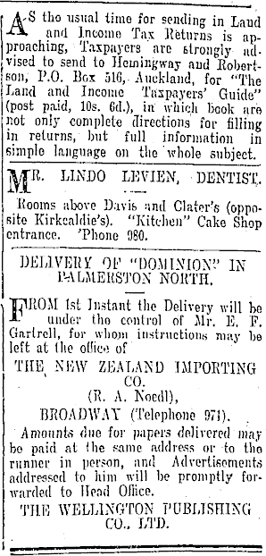 AS tho usual time for sending in Laud and Incoino Tax Returns is approaching, Taxpayers are strongly- advised to send to Hemingway and Bobertsoi),' I'.O. llf.i 510,- Auckland, for "The Land and Income Taxpayers' Guide" (post paid, 10s. 6d.), in which book are not only complete directions for filling in returns, but full information in simple language on the whole subject. M R - LINDO LEVIEN, DENTIST. ■Rooms above Davis ;ind Clater's (opposite Kirkcahlie's). "Kitchen" Cake Shop entrance. 'Phone 980. DELIVEM OF "DO.UINION'.' IN I'-ALiUEKS'J'ON NORTH. "IjlIlOM Ist Instant the Delivery will be A under tho control of Mr. E. F. Garlrell, for wliojn instructions may be left at (lie odico of THE NEW ZEALAND IMPORTING CO. (R. A. Noedt), BROADWAY (Telephone !)71). Amounts due for papers delivered may bo paid at (lie same Address or to tho runner in person, and Advertisements addressed to him will be promptly forwarded to Head Office. TILE WELLINGTON PUBLISHING CO.. LTD.