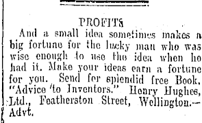 PROFITS . . And a, small iiloa sometimes makes a big fortune far tlio lucky man who was vi'so enough In use the idea whon ho had it,. Make your ideas earn a fortune for you. Send for splendid free Book, "Advice to Inventors." Henry Hughw, ;Ltd„ Foatherston Street, Wellington. - | Advt.