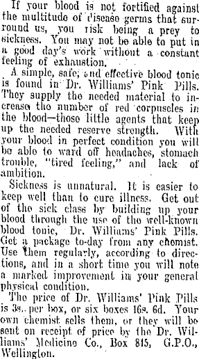 If your blood is not fortified against the multitude of c'isoaso germs that surround us, you risk being a prey to Kickness. You may not be able to put in ft good day's work without a constant feeling of exhaustion. ■ A simple, safe; ind effective blood tonic is found in ; Dr. Williams' Pink Pills. 1 hoy supply tho needed material to increaset tho number of red corpuscles in the blood-tlioso little agents that keep up tho needed reserve strength. With your blood in perfect condition you will bo ablo to ward off headaches, stomach trouble, "tired feeling," and lack of ambition. Sickness is unnatural, It is caeier to keep well than to cure illness. Get out of tho sick class by building up your blood through the usp of the well-known blood tonic, Dr. Williams' Pink Pills. Get a package to-day from any chomlst. Use them regularly, according to directions, and in a short time you will noto a niarltod improvement in your general physical condition. Tho price of Dr. Williams' Pink Pills is 3a.. per box, or six boxes 16?. Gd. Your own chemist soils them, or I hey will bo sent on receipt of price by thn'Dr. Williams' Jlcdicino Co., Box 815, G.P.0., Wellington.