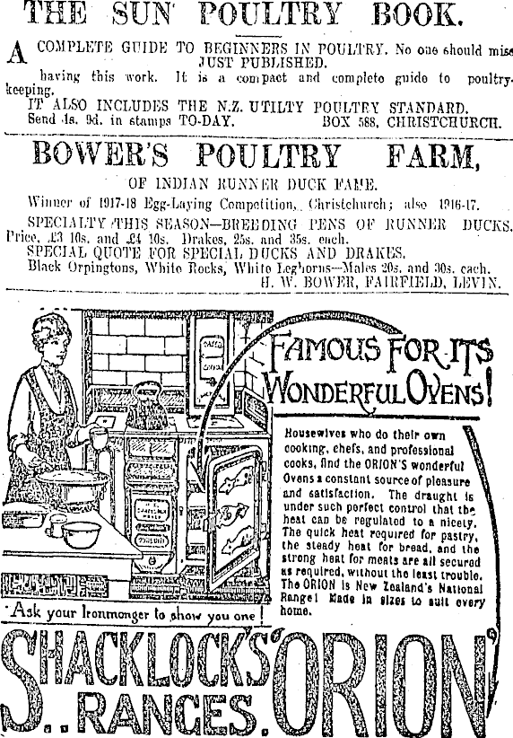 THE SUN , POULTRY BOOK. ' A COMPLETE GUIDE TO BEGINNERS IN POULTRY. No oae should miss JUST PUBLISHED. having this ivork. It is a. vompaot and complete puide to poultrykeeping. IT ALSO INCLUDES THE N.Z. UTILTY POULTRY STANDARD. Send .la. 9d. in stamps TO-DAY. BOX 588. CHMSTCHURCH. J s~PouiMF — pabST" ■ OF INDIAN KUNNHK DUCK I'.U'E. Winner of 1917-18 Egg-Laying Competition,.. (Ihristclnirch; ulso IPIB-l". SPECIALTY .THIS KEASON-BHEEDING PEN'S OF JiUNNEK DUCKS. Pnco, .a 10s. and £i lfls. Drakes, 255. and 355. ciiuh. SPECIAL QUOTE FOR SPECIAL DUCKS AND DRAKES. Black Orpingtons, White Hocks, Wliito 20s. and 30s. each. H. W. BOWEK, FAIRFIELD, LEVIX. %\F SI ! F"l Tor ! ~l li r—l \J\< I **i JwlAv? rUK-11 >3 '' "i Holl " wlv,! » Wo do their own WW%s& oookinf, chefs, and professional % p^^4JH s ,| pllla MFyM cooks, " ni, the OR,ON ' S wondw w ■MT!itSo" M Thed'«Srta^ I j « |l under such Porfecl control thai tb« i i" 1 CM be regulaiod to > nicely. tfc-J ' jT/yp The I" 1 '* heat roquired fop pastry, > —/ s>s 5 lhe sle J d y he»t for bread, and the a.7 i jsrA ,lriin ß he »l for moan are ail securod ««required, without the lent trouble. The ORION Is New Zealand's NMionai i—— — -^ ar^S — Rug«l Made in mei u» suit every Xl3k your Ironmonger to ,thow you one I ,10me '