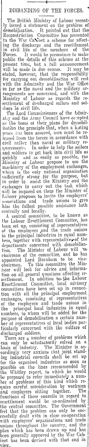 •* DISBANDING OF THE FORCES. * The British Ministry of labour recently issued a statement on the problem of demobilisation. Tt pointed out that tho Reconstruction Committee has presented to the War CaVnet a scheme for affecting the discharge and the resettlement in civil life of the members of the Forces. It would bo premature to make public the details of this scheme at the present time, but a full announcement will be made in dine course. It may be stated, however, that the responsibility for carrying out demobilisation will rest with the Admiralty and the War Office so far as tho naval and the, military arrangements are concerned, and with tho Ministry of Labour as regards the resettlement of discharged sailors and soldiers in civil life. '.Die Lord Commissioners of the Admiral c,y and the Annv Council have accepted as the basis ot their plans for demobilisation the principle that, when a li.sting psacu has been assured, men must be released from the forces in accordance with civil rather than naval or military requirement*. In order to help the sailors and soldiers (o get back into civil life as quickly and as easily as possible, the Ministry ol Labour propose to use the machinery of the employment exchanges, which is the only national organisation 'jurticientlv strong for the purpose, but in order "to assist, the Ministry and the exchanges to carry out the task which will be imposed on them the Minister of Labour proposes to invite, the employers associations and trade unions to give him the fullest possible assistance both centrallv and locally. A central committee, to be known as the Labour Resettlement Committee, has been set up, consisting of representatives of thß employers ,and tho trade unions in tho principal industries in equal numbers, together with represcntativej-of the departments concerned with demobilisation. Tho Minister of Labour will «t> chairman of the committee, and he has appointed Lord Burnham to be vicechairman. To this committee the Minister will look for advice and information on all general questions affecting resettlement. In addition tovtho Labour Resettlement Committee, local advisory committees have been set up in connection with all the principal employment exchanges, consisting of representatives of the employers and trade unions in the principal local industries in equal numbers, to whom will be added for the purpose of demobilisation a certaiu number of representatives of local bodies particularly concerned with the welfare of discharged soldiers. There are a number of problems which can only be satisfactorily solved an a basis of industry. The Minister is.accordingly very anxious that joint standing industrial councils shall be set up for the organised industries as soon as possible on tho lines recommended by the Whitley report, to which he would be prepared to refer immediately a number ot problems of this kind which require careful consideration by workmen and employers sitting together. The functions of these councils in regard to resettlement would be co-ordinated by tho central committee. The Government feel that the problem can only be successfully dealt with in close co-operation with employers' organisations and trade unions throughout the country, and the plan which has been drawn up and has been generally approved by the War Cabinet has been devised with that end in view.