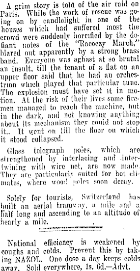 A "rim story is told of tlie air raid on Paris. While the work of rescue was going on by candlelight in one of the lionises "which had suffered most the crowd were suddenly horrified by the defiant notes of the "Eaooczy March,-" blared out apparently by a strong brass band. Everyone was aghast at so brutal an insult, till the tenant of a flat on an upper floor said that lie had an orchestrion which played that particular tune. Tho explosion must have set it in motion. At the risk of their lives some firemen managed to reach the machine, hut in the dark, and not knowing anything nbout its mechanism they could not. stop it.. It wont on till the floor on which it stood collapsed. Glass telegraph poles, which are si lengthened by interlacing and .intertwining with wire net, are now made. They arc particularly suited for hot climates, whero wooi! poles soon decay. Solely for tourists, Switzerland hiiv built an aerial trumv.ay, a mile and a half long and ascending to an altitudo of nearly a mile. . National efficiency is weakened by coughs and colds. Prevent this by taking NAfIOL. Ono doso a day keeps colds away. Sold everywhere, Is. Gd—Advt.