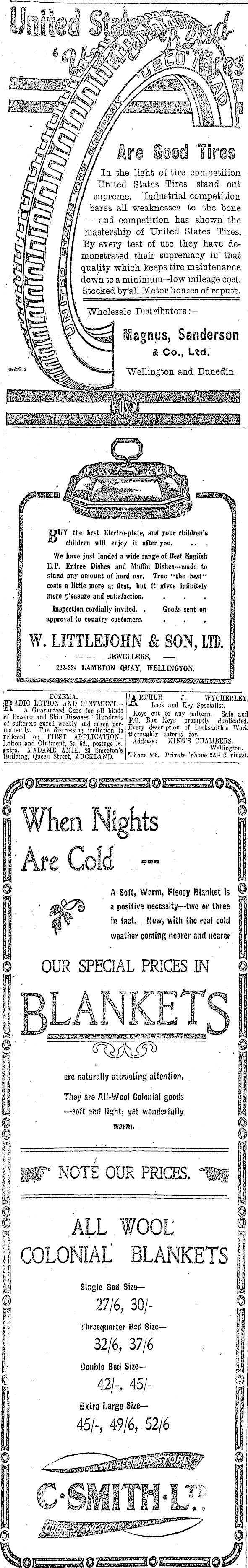 /ill e li&ht of tire competition Mi States Tires stand out /CvC-Cf ill supreme, 'industrial competition Ml ares weaknesses to the bone W" IB I ~ com P e^*iorL as the r~ $s!*j Ml mastership of United States Tires. CH It every test of use they have de*b ™ monstrated their supremacy in' that ,cl s3' Si quality which keeps tire maintenance v. c 3 B own *° a minimum—low mileage cost. V fe Stocked by all Motor houses of repute. ■jj gt—>\ i <52\\ .Wholesale Distributors.' — ■ lagnus, Sanderson °' &e,2 Wellington and Dunedin. TJUY the best Electro-plate, and your children's *■* children will enjoy it after you. . - . j We have just landed a wide range of Best English i : E.P. Entree Dishes and Muffin Dishes—made to j I stand any amount of hard use. True "the best" costs a little more at first, but it gives infinitely more pleasure and satisfaction. ... [ I Inspection cordially invited. . Goods sent on ; approval to country customers. ... ■ W. LITTLEJOHN & SON, LTD. | JEWELLERS, 222-224 LAMETON QUAY, WELLINGTON. (RADIO LOTION AND OINTMENT.- and Key Sne^alist™ 1^ 2-v A Guaranteed Cure for all kinds v ..,, ~,,. t . .„., „iA of , cf Eczema and Skin Diseases. Hundreds p^ ys R ° Ut vL J mm, XA S? of sufferers cured weekly and cured per- £°- B °* }> e *\ P">W .^P h \^ mnnently. The distressing irritation is *? vel 7 description of Ix-cksmith's. Work lelieved on FIRST APPLICATION., tnoroughly cater*l^J/>tion and Ointment, ss. 6d., postage Iβ. AddrMS: klhG S fxtra. MADAME AMIE, 23 Smeeton's _. „„..,, Wellington Building, Queen Street, AUCKLAND. Thone SSB ' P"vate 'phone 2234 (2 rings). ssj m\ ■® A Soft, Warm, Fleecy Blanket is © a positive necessity—two or three ' M*y in fact. Now, with the real cold * I I weather coming nearer and nearer | D OUR SPECIAL PRICES IN 0 |' ' <?§&&> , p j are naturally attracting attention. | I They are AINWooI Colonial goods \ | fj —soft and light, yet H f ' warm. fi, ij ytt NOTE OUR PRICES, f| I ALL. WOOL I |) COLONIAL BLANKETS |j Sir.gle Bed Size— jj I 27/6 ' 30/ ' I s Theeequarter Bed Size— 11 ! . 32/6, 37/6 , I i Double Bed Size- H| I ■ 42/-, 45/- I £ Extra Large Size— 45/-, 49/6, 52/6 8$ M