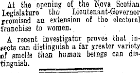 At the opening of the Nova Scotian Legislature tho Lieutenant-Governor promised an extension of tho electoral t'ranchi39 to women. A recent investigator proves that ineccte can distinguish a far greater varioty of smells than human beings can distinguish.