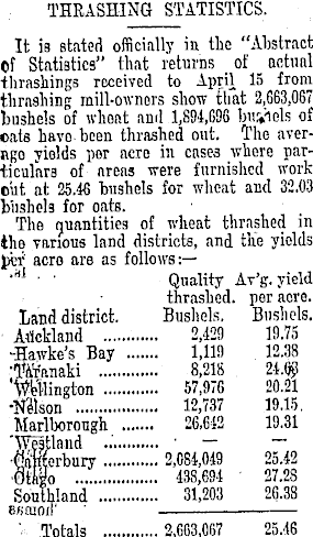 THRASHING STATISTICS. It is stated officially in the "Abstract Cf Statistics" that returns of actual thrashings received to April 15 from thrashing mill-owners show that 2,663,087 bushels of wheat anil 1,894,696 bushels of cats have been thrashed out. The averngo yields per acre in case 3 where particulars of areas -were furnished work tut at 25.46 bushels for wheat and 32.03 bushels for oats. The quantities of wheat thrashed in the various land districts, and the yields pbi' aero are as follows:— ■ Hi ■ ■ Quality Av'g. yield thrashed, per acre. Land district Bushels. Bushels. ■ Auckland 2,429 19.75 -Hawke's Bay 1,119 12.38 ■TOanaki 8,218 24.8? Wellington 57,976 20.21 •Mson 12,737 19.15. Marlborough 26,642 19.31 '\Vestland ..' • — ~ -vMerbury 2,084,049 25.42 •Stago 438,694 ' 27.2S Southland 31,203 26.38 B«ffloiT — ' Totals 2,663,067 25.46