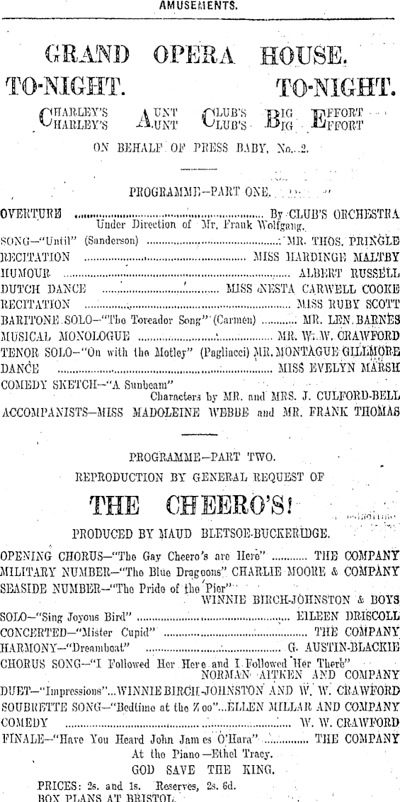 AMUSEMENTS. GRAND OPERA HOUSE. TO-NIGHT. TO-NIGHT. (HHARLEY'S l UNT pLUB'.S T>IG WFORT -■• ■ . i"i.UNT JL>K4 -.-^FFORT ON BEHALF OF PRESS BABY, N0...2. PROGRAMME-PART ONE, ..>.>•" OVERTURE! .' By CLUB'S ORCHESTHA Under Direction of Mr. Frank Wolfgang. SONG-"Until" (Sanderson) , -.'ME. THOS. PItfNGLE RECITATION MISS HARDINGB MALTBY HUMOUR '. ALBERT RUSSEIL DUTCH DANCE .'. ...'. MISS a\ESTA CA.RWELL COOKE RECITATION ....: MISS RUBY SCOTT BARITONE.SOLO-'Tbo Toreador Song"'(Carmen) MR, LBN,BARNES MUSICAL MONOLOGUE '. MR, WUV. CRAWFORD TENOR SOLO-"On with the Motlej" (Pagliacci) MR. MONTAGUE-OlttjlOßE DANCE ; '. MISS EVELYN MARSH COMEDY SKETCH-"A Sunbeam" ■ v • Characters by MR, nml MRS. J. CULFORD-BELL ACCOMPANISTS-MISS MADOLEINE M T EBIIB mid MR. FRANK THOMAS PROGRAMME-PAKT TWO. REPRODUCTION BY GENERAL REQUEST OP THE CHEERO'Sr; ■ ~',; ;m;i PRODUCED BY MAUD BLETSOE-BTJCKERIDGE. ■' : " . : "" OPENING CHORUS-'Tho Gay Cheero's arc Hoe" THE COMPANY MILITARY NUMBER-"Tho Bluo Dragoons" CHARLIE MOORE & COMPANY SEASIDE NUMBER-"Tho Pride of tlio'Pior" ■ . . . . WINNIE BtKCEJOHNSTON & BOYS SOLO-"Sing Joyous Bird" ; EILEEN DRI6COLL CONCERTED-"Mister Cupid" ! THE COMPANY HARMONY-"Dreamboat" ; G. AUSTIN-BLACKIE CHORUS SONG-"I Followed Hor Here and I.Followed "Her Threb" NORMAN- AITKEN AND COMPANY DUBT-"lmprcssioi]B"...WlNNlE BIRCH -JOHNSTON AND W.' W.' CRAWFORD SOUBKETTE SONG-"Bedlimo at the 'Aoo"...tiWSs MILLAR AND COMPANY COMEDY '. , :.... W. W. CRAWFORD FINALE-"Have You Heard John Jam es' O'Hura" ..'... THE COMPANY At tho Piano—Ethel Tracy. ■ GOD SAVE THE KING. PRICES: 2s. and Is. Beserves, 2s. 6d. BOX PLANS AT BRISTOL; '■ ■•