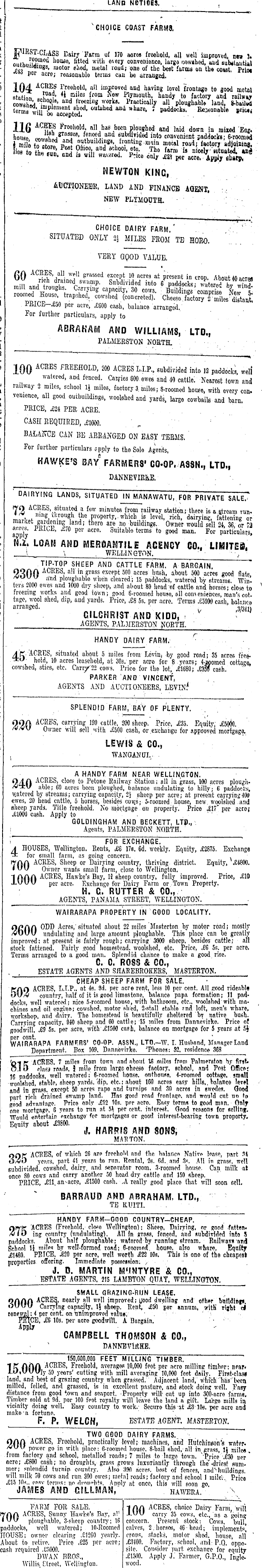 ' LAND NBTIOE3, ~ . . t 'CHOICE COAST FARMB. d •' . k E&iry Farm uf 170 aoree freehold, all well improved, nro }- s outh»iM meft llolue, &tt( s wlth every convenience, large wwehed, and auUlautial .. "utbailißgs, motor elied, metal road; one of the best tonne on\b. coaatV PilpJ ~ *« per acre; reasonable terms can be arranged. ' 104 ACRE , S freehold, all improved and having level frontage to good metal ! ' station J, i * Pi 1,8 ? fOm S ? w mouth . aandy to factory and railway !' mntad ' aU * d T^ 0 ?* , Vt <* ti <* ti y «H ploughabU tad, β-bailrf I Urma • Md * W *' 7 dMto - ' Be3eon,lb ' e » ri< *< 116 AC hF? Proell, > ld ; all has been ploughed- and laid down in mixed Eμ. J«">«e "WMded into convenient paddocks; 6-roomed NEWTON KING, AU'CriONEBB, LAND AND FINANCE AGENT. :, NEW PLYMOUTH. • ■ \ '■ • CHOICE DAIRY- FARM.' ' ' ' ■ SITUATED ONLY 21 MILES JBOM TB HOBO. VERY GOOD VALUE. roomed House, trapslied, cowshed (concreted). i PHICE-iiaO per acre, ,£6OO cash, balance arranged. For further particulars, apply to ' . ) ABRAHAM AND WILLIAMS, LTD., J ■ . . PALMERSTON NOETH. ./ e 2QQ ACH.ES FREEHOLD, 200 ACRES L.1.P., subdivided into 12 paddocks well watered, ami fenced. Carries 600 ewes and 40 cattle; Nearest town and U railway 2 miles, school 1} miles, factory 3. miles; β-roonwd house, with every coa. • „ vemence, all good outbuildings, woolehed and yards, large oowbtile - and barn. * PRICE, .£24 PER ACRE. .... 3 CASH REQUIRED, ,£IOOO. BALANCE CAN BE ARRANGED ON EASY TERMS, I For further particulars spply to the Sole Agents, j HAV/KE'S BAY 0 FARMERS' CO-OP. A3BN., LTD., DANNEVffiIvE. . ■• DAIRYING LANDS, SITUATED IN MANAWATU, FOR PRIVATE SALE." 72 AC ,^ S, M Bituat i few minuteß from ? ailway station; there iea.fttroam run- * rr, , J»"g vfcrough the property, wliich is level, rich, dairrinc, fattening or ■ ??} et ifflfri? ,n f J and! sn are no MMinge. Owner would sell 24, 36, or 73 awes. PRIoL, £,Q per acre. Suitable terms to ■ good man. For particulars, ■> N.L LOAN AND MEROAMTILE ACENCY CO.. LIMITEB, , i_ \_ WELLINGTON. " ■ ; ", TIP-TOP SHEEP AND CATTLE FARM. A BARGAIN. " > 2300 ' lCE J Eb ; n!1 in &™ ss «eept 500 acres bush, about 600 acres good flats ) """vv and ploughable when cleared'; 15 paddooks, watered by streams Win- , ters 2000 ewes and 1000 dry sheep, and about 80 head of cattle and horses; close to N freezing works and good town; good 6-roomed house, nil comeniences, man's cot- < tnge, wool shed, dip, and yards. Price, ,-68 ss. per acre. Terms /;5000 cash, balance I arranged. . • 3lsii\ CILGHRIST AND KIDD, . V I AGENTS, PALMERSTON NORTH. ' . \ HANDY DAIRY FARM. r - ■ ■ ... AK- ACRES, situated about 5 miles from Levin, by good road; 35 acres freehold, 10 acres leasehold, at 30s. per acre for 8 years; 4-Momcd cottaco. ; cowshed, sties, etc. Carr/22 cows. Price for the lot, .£1680; J2O cash. PARKER AND VINCENT, • AGENTS AND AUCTIONEERS, LEVINf t • : — '—- — :— : . _ \ SPLENDID FARM, BAV OF PLENTY. f OOA ACBES, carrying 190 cattle, 200 sheep. Price, £3b. Efjiiity; ,£so<to. ''" vu Owner will sell with iSOO cash, or .esohaiige for appro Ted moftgaga. ; LEWIS & CO., i , WANGA^tJI v ■ A HANDY FARM NEAR WELLINGTON. . 94.0 close to Petone Railway Station; all in grass, 100 acres ploiigh/JttV able; 60 acres been ploughed, balance undulating to hilly; 6 paddoc&s, Watered by streams; carrying capacity, 2} sheep per acre; at present carrying 400 ewes, 20 head cattle, 5 horses, besides cow.s; 5-roomed house, new. wqplshed and sheep yards. Title freehold. No mortgage o" property. Price ,£l7" per acre: .61000 cueh. Apply to 6 . F ■ • v QOLDINQHAM AND BECKETT, LTP., . j Agents, PALMERSTON NORTH. . FOR EXCHANGE. ' 4 HOUSES, Wellington. Rents, £& Vβ. 6d. weekly. Equity, .£2875. Exchange for email farm, as going concern. ft , A A ACRES, Sheep or Dairying country, thriving, district. Equity, £4800. iUU Owner wants small farm, close to Wellington. 1 fbftA ACRES, Hawke's Bay, 13 eheep country, fully improved. Price, .£lO J-l/Ul/ per acre. Exchange for Dairy Farm or Town Property. H. 0. RUTTER & CO., ; AGENTS, PANAMA STREET, WELLINGTON. • WAIRARAPA PROPERTY IN GOOD LOCALITY. OfJAA ODD Acren,'situated about 22 miles Mnsterton by motor road; mostly /6\)\J\J undulating; and large amount pjoughable. Thie place can be greatly improved: at present is fairly rough; carrying 3000 eheep, besides cattle; all stock fattened. Fairly .?ood homestead, woolshed, etc. Price, ,£6 ss. per acre. Terms arranged to a good mnn. Splendid chance to make a good rise. C. C. ROSS & GO., . , ESTATE AGENTS AND SHAREBROKERS, MASTERTON. CHEAP SHEEP FARM FOR SALE. KAO ACRES, L.T.P., at 4s. 9d. per acre rent, less 10 per cent. All irood ridenbli O\)i4 country, half of it is good limestone, balance papa formation; 11 paddocks, well watered; nice 5-roonied houeo, with bathroom, etc., woolshed with ma- ( chines and oil engrine; cowshed, motor shed, 2-atnll etahle ?nd loft, men's whare, workshop, and dniry. The homestoad is beautifully sheltered native bueh. Carrying capacity, 040 sheep and 60 cattle; 15 miles from Dannevirke. Price of goodwill, ss. per acre, with' cash, balance on mortgage for 5 years at SJ per cont. WAIRARAPA FARMf-RS' CO-OP. ASSN., LTD.—W. I. Husband, Manager Land Department. Box 109, Dannevirke. J Phonca: 32. residence 368 'O1 K. ACRES. 7 miles from town nnd nbawl U! milns from Palmereton by fint 0.1 0 nlnsj ronds, J mile from large oheeso fnetory, echocl, and Post Offico; 16 pxddooke, well watered; 6-roomed honse. ontbonw, 4-roomed cottage, smell wonlshed, stable, sheep yards,'dip, etc.; about 160 acres easy hills,, balance level and in grans, except 50 acres rape and turnips nnd 30 acres in ewodes. Good part rich drained swamp land. Ha? jfood road fronlngp. and would cut nn h good advantage. Price only JCI2 10a. per acre. Ensy term* to good mnn. Only one mortgage, 6 years to rnn at 5\ per cent, interest. Good yeneons for eelHnjf. 