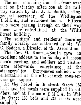 The men returning from the front were met on Saturday afternoon at the railway station by Mr. A. E. Smith, actinggeneral secretary of the Wellington Y.H.C.A., and welcomed home. Fifteen who were passing through on their way home were entertained at the Willis Street building. The soldiers' and residents' morning family worship was addressed by Mr. W C. Bndden, a Director of the Association. The Eev. G. Knowjes-Smitii gave an excellent address to the Sunday afternoon men's meeting, and soldiers and visitors were afterwards entertained at the strangers' tea. Sixty-seven soldiers were entertained at the after-church song-ser-vice and supper. At the hostel in Boulcott Street 187 beds and 520 meals were supplied to soldiers, and at the main Y.M.C.A. in Willis Street 163 beds and 245 meals were supplied.