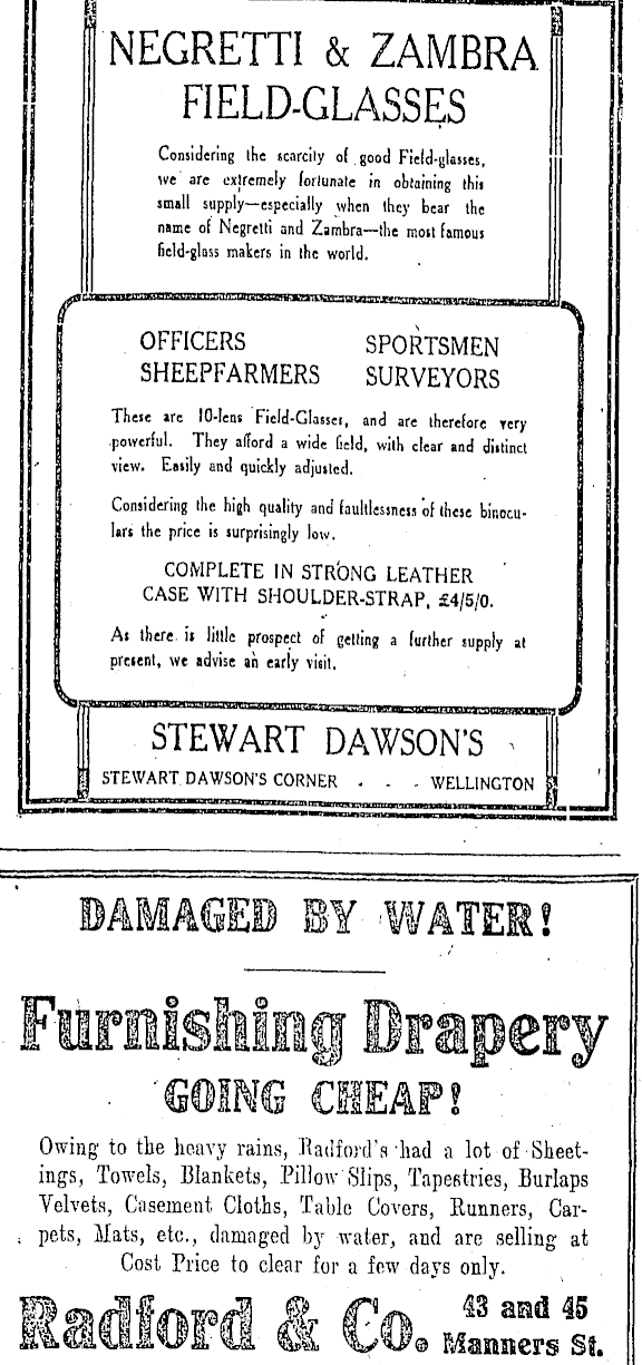 INEGRETTI & ZAMBRaI FIELD-GLASSES Considering ihe scarcity of good Field-glasses, we' are extremely fortunate in obtaining this smill supply—especially when they bear the name of Negretti and Zsmbra—the most famous field-glass makers in the world. OFFICERS SPORTSMEN SHEEPFARMERS SURVEYORS These »rc 10-lens Field-Glassei, and are therefore rery powerful. They afford a wide field, with clear and distinct view. Easily and quickly adjusted. Considering the high quality and faultlessness of these binoculars the price is surprisingly low. ' COMPLETE IN STRONG LEATHER ' CASE WITH SHOULDER-STRAP. £4/5/0. As there, it little prospect of gelling a further supply at present, we advise an early visit. IMtT "" 1, "" ,l " 1M """''"" 111J^^-i '""--" i " ll HiTri , i!ffnMii'L'7l J lTTr* l *'lll'^im>!iiijimrj^^yH|^ifflm^yM^y' STEWART DAWSON^sH STEWART. DAWSON'S CORNER . . . WELLINGTON \ ' DAMAGED BY-WATER! • 'GOING CHEAP! : ' Owing to the heavy rains, Kailford's 'had a lot ■of ■ Sheetings, Towels, Blankets, Pillow Slips, Tapestries, Burlaps Velvets, Casement Cloths, Table Covers, Runners, Cars pets, Mats, etc., damaged by water, and are selling at Cost Price to clear for a few days only.