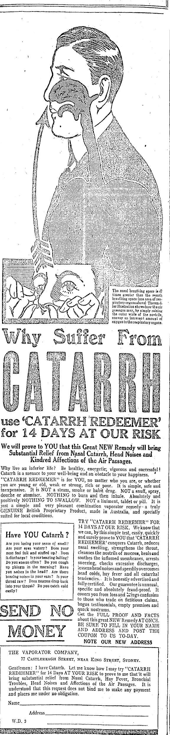 ■f 111 ' • s Vi Then»M]WeatMiig,pacei«<V : for 14 DAYS AT OUR RISK We will prove to YOU that this Great NEW Remedy will bring Substantial Relief from Nasal Catarrh, Head Noieee and Kindred Affections of the Air Passages. Why live au inferior life? Be healthy, energetic; vigorous and successful! Catarrh is a menace to your well-being and an obstacle to your happiness. ' "CATARRH REDEEMER" is for YOU, no matter who you are, or whether you are young or old, weak or strong, rich or poor. It is simple, safe and inexpensive. It is NOT a steam, smoke or habit drug. NOT a snuff, spray, douche or atomiser. NOTHING to burn and then inhale Absolutely and positively NOTHING TO SWAIAOW. NOT a liniment, tablet or pill. It is just a simple and very pleasant combination vaporator remedy- a truly GENUINE British Proprietary Product, made in Australia,' and specially suited for local conditions. __ TRY "CATARRH REDEEMER" FOR H DAYS AT OUR RISK. We know that Haw YfilJ Cafcirrli ? WC J eaD, test, easily, quickly nave lUU V,aiarm . aud surely prove to YOU that'CATARRH Are you losing: your sense o| smell ? REDEEMER , conquers Catarrh, reduces Are tout eyes waters , ? Doei your nasa l swelling, strengthens the throat, nose fee] full end sluffed up? Do?s cleanses the nostrils of niucoui, heals and it discharge? Is your hearing failtnc? soothes the inflamed membranes, arrests Do you meeze often? Do you cough sneezing, checks excessive discharges, up phlegm in the mornius? Have lessensheadnoiscsandspeedilyovercomes yon ».»» in the, h«d f. Are thero bead coW h f £ Q(J f, , , *&™£Z£*£&- a dvertisedand into your throat? Do you catch cold Ul "y certified. Our guarantees unusual, eKsily ? ■ specific and absolutely fraud-proof. It covers you from loss and mings confusion I to those who trade on fictitious claims, Sra-STOi. rnv-*. bo S us testimonials, empty promises and fih r%J I S W* U 1 l uav:k nostrums. JL-fli Nj SLJ* AXI \J? Oet the FUIA PROOF AND FACTS ■■ — ■ about this great NEW Remedy AT ONCE. M—. - ««-««, p B E SURE TO FIIA IN YOUR NAME H 1 Sn*J IN W AND ADI) RESS AND POST THE XJ?mMLA it COUPON TO US TO-DAY. NOTE OUR NEW ADDRESS THE VAPORATOR COMPANY, 77 Castlerbagh Strebt, nsar King Strebt, Sydney. Gentlemen: I have Catarrh. I<et me know how I may try "CATARRH REDEEMER" for 14 Days AT YOUR RISK to prove to me that'it will bring substantial relief from Nasal Catarrh, Hay Fever, Bronchial Troubles, Head Noises aud Affections of the Air Passages. It is understood that this request does not bind me to make any payment and places me under no obligation, Name__ Address. . W.D. 3 , .