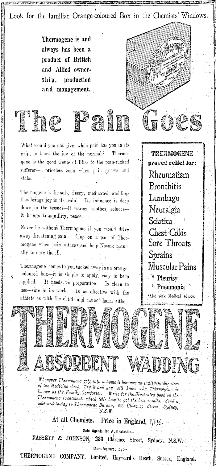 i i . \ \ Look for the familiar Orange-coloured Box in the Chemists , Windows. \ { Thermogene is and . '' I always has been a jfCl ' -•'■" I I product of British " ■ ; ' " I -«« mKtSm ::^\ I ship, production ■ J and management. - ;'■' r What would you not give, when pain has you in its S j grip, to know the joy of the normal? Thermo- THERMOGENE ' geno is the good Gcuie of Bliss to the pain-racked ' proved relief jfor: \\ sufferer—a priceless boon when pain sniaws and . , ■-, ij stQbg t . Rheumatism i . ' Bronchitis I Thermogene is the soft, fleecy, medicated wadding T , ' •; J that brings joy in its train. 'Its influence is deep ; \LUIIIDagOJ down in the tissues—it Avarins, soothes, solaces— - ' \ it brings tranquillity, peace. N t , I ■ ' ; baatica. ' "■"■ 'i Never be withouf, Thermogene if you would drive ni , p Sij j away threatening pain. Clap on a pad of Ther- V «^ J mogene when pain attacks and help Nature nutur- b'OfC 1 lit O3,tS I ally to cure the ill. . ... • SofiiinS J Tkermogeae comes to you tucked away in an orange- MtJSCukr PaillS j % coloured box-it is; simple to apply, easy to keep ' .' *' ■ J applied. It needs.no preparation. J s clean to •, . * p neu *«{,, \ I we-eure-k^ts -work. . Is. as effective with tk i nfliiofo n<: Tt-U?, fu n n n, , ' *Als6 .seek Medical advice. j atnlete as with the chfld.- and cannot harm either. \- :_..;.;.:. ;.,„._.:„.._„... l ll ™™V imi °O™ gets. into a heme it becomes an indispensable item of the Medmne chest. Try it and you will how why Thcr m o,,cne « Mown as the^lamdy.Comforter. Write for the illustrated bool ov the Thermogene.Treatment, -wMchtelh how to get the hcsl remits. Scud a . .postcardto-day to Thermogeneßureau, 233 Clarence Street Svdnev ■:.'■■ -■'■■ ■■■.'■ : :":. ; : ' ■' N - S - W - ' At all Chemists. Price in England, ( . •..•■•''■.. Sole Agents for Australasia:- > FASSETT & JOHNSON, 233. Clarence Street, Sydney, N.S.W. ; ' Manufactured by:— THERMOGENE COMPANY, Limited, Hayward's Heath, Sussex, England.