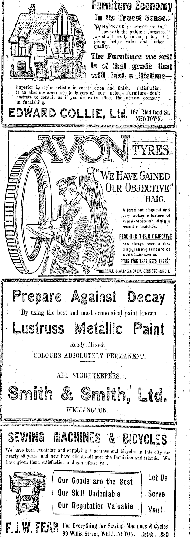 Jn-'lis.Traest Sense.;-}" j ' \ ' JL ' joy with.the public is.because "'". ' ftrs&ml O 'we _ stand (irmly to our, policy of .. ; i ■inmi"""l£ri i- ** ~~ i»ini7i'H--.i[ ■ |fy3*y\ ifivini? fosttcr 'VflluG find liicrliGr ! t γ-j Tjfee' FjnrnSfiiire. we sell j «e-ol.niat;drafe-Mlial '". } J will SasS-a .Jileysne-! • i i! Superior ijt' stylo—artistic in construction and finish., 'Satisfaction ■ ' , is an .abaolute assuranoe to buyers of our- noted*-: Furniture—don't | •■ ] .J ' ' hesitate to consult us if you desire to effect the • utmost economy :. . ■ Ij ' "in furnishiiiij. : . "•• ••■■■ ■'.■■' •- ■•'• i EDWAiD COLLIE, Lti 16 JS^ : s \ ~"" I II ff i'l 'IHi wMwiff vO I) In A terse but eloquent and ! ""* 111 —-—^y'ST^mMli^WW , I Hl'll'/i Field-Marshal Halg'f ■ W ' "WHOLES.UM'IAUfIG 4 Z> L". CRRISKHURCH. .! 8 vo> fo? (fcia 3%» #*% ffii @4 8 !19 «3 » <fe» @ w ■ ■ 'By using the best and most economical paint known. , ■ j ■ Paint ■ Ready Mixed , . ' I COLOUES ABSOLUTELY PERMANENT. ! ALL STOREKEEPERS.:.' J WELLINGTON. ,[ '.SEWING iACHiisTBICYGLir I Wβ have been repairing and supplying machines and bicycles in this city for ' nearly 40 years, and now have clients all over the Dominion and, islands. We, ' j have (fiven thorn satisfaction ond can pfeaso you. ' : T ~ I at Me ; Our Goods are the Best l U!> ] ■ Our Skill Undeniable Serve i Our Reputation Valuable y ou j \ F S W For Everything'for Sewing Machines* Cycles I .J, «IW. B fanes 99 Willis Street, WELLINGTON. Estab. 1880 I \