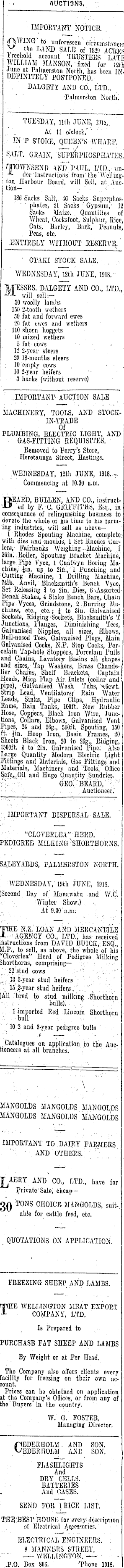 AUCTIONS. IMPORTANT NOTICE. , ' " nfnrfSeG n ciroumstancM y tin; LAND SALE of 182!) ACRES ' accoul 't TRUSTEES LATE WILLIAM MANSON, fixed for I2lh June at Palmerston North, has been IN--1 DEFINITELY POSTPONED. DALGETY AND CO., LTD., Palmerston Northi ' . 1 TUESDAY, 11th JUNK, 1915,. , .. » At H bfeloek.'" IN P STORE, QUEEN'S WIIARF. SALT. GRAIN, SUPERPHOSPHATES. ■ nnOWNSENH ANd'p-WL. :LTD..-nn- , I -dor 'instructions from" tho "Wellingi : lon Harbour Board, will Sell, at Auci tiou— 18G Sacks Salt,. 4G Sacks Superphosphates, 21 Sacks 'Gypsum,' 12 1 Sacks Maize. . Quantities of "Wheat, Cocksfoot, Sulphur, Rice, Oats, Barley, Bark, Peanuts, . Peas, etc. .ENTIRELY "WITHOUT RESERVE. ' OTAKI STOCK SALE. WEDNESDAY, 12th JUNE, 1918.' 1/fESSRS. DALGETY AND CO., LTD., - Lyj! - will soil:— 50 woolly lambs 150 2-tooth wethers 50 fat and forward ewes 20 fat ewes and wethers 110 .shorn hoggets 10 mixed wethers 5 fat cows 12 2-year steers 20 18-months steers 10 empty cows 10 2-year heifers 3 hanks (without reserve) : .. IMPORTANT- AUCTION SALE MACHINERY, TOOLS, AND STOCK-IN-TRADE Of PLUMBING, ELECTRIC LIGHT, AND ■ ' GAS-FITTING REQUISITES. Removed to Perry's Store, Heretaunga Street, Hastings. WEDNESDAY, 12th JUNE, 1918— Commencing at 10.30 a.m. "DjEAIID, BULLEN, AND CO., instruct'iJ ed by F. C. GRIFFITHS, Esq., in consequence of relinquishing business to devote- tlie whole of Ms time to ills farming industries, will sell as above— 1 Rhodes bpouting Machine, complete; with dies and -moulds, 1 Bet Riiodes Curlers,; Fairbanks Weighing- Machine, 1" 3Gin. ; Roller, Spouting Bracket large Pipe Vyce, 1 Cnatwyn Boring Machine,-: iin. up to 2in.,' i Punching and Cutting Machine, 1 Drilling Machine, 741b. Anvil, Blacksmith's Bench Vyce, Set Releasing i to 2in. Dies, Bench Stakes, 4 Stake Bench Bars,. Cham Pipe Vyces, Grindstone, 2 Burring Machines, etc., etc.; i to 3in. Galvanised Sockets, Ridging-Sockets, Blacksmith's '1 Junctions, Flanges, Diminisliing Tees, Galvanised Nipples, all sizes, Elbows, Bull-nosed Tees, Galvanised Plugs, Main Galvanised Cocks, N.P. Stop Cocks, Porcelain Tap-hole Stoppers, Porcelain Pulls and Chains, Lavatory Basins all shapes and sizes, Tap Washers, Brass Chande-1 lier Chains, Shelf Brackets, Captain [ Heads, Mica Flap Air Inlets (collar aad pipe), Galvanised Wash Tubs, xfiewt. Strip Lead, Ventilators,' Rain Water Leads, Sinks, Pipe Clips, Hydraulic Rams, Rain Tanks, 100 ft. New Rubber Hose, Coppers, Black Iron Wire, Junctions, Collars, Elbows, Galvanised Vent Pipes, 24 and 2Gg., sUoft. Spouting, 150 ft. Jin. Hoop Iron, Basin Frames, 20 Sheets Black Iron, 20 to 26g., Ridging, 1500 ft. 1 to'2in. Galvanised Pipe. Also Large Quantity Modern Electric Light Fittings and Materials, Gas Fittings and Materials, Machinery and Ofiico Safe, Oil and Hugo Quantity Sundries. VGEO". BEARD," ; . - Auctioneer. '.IMPORTANT DISPERSAL SALE. • "CLOVERLEA" HERD. PEDIGREE MILKING 'SHORTHORNS. SALEYARDS, P.ALMBRSTON NORTH. WEDNESDAY,' 19th JUNE, 1918. (Second Day of Manawatu and W.C. Winter Show.) . At 9.30 a.m; THE N.Z; LOAN AND MERCANTILE 'AGENCY CO., LTD., has received instructions from DAVID BUICK,-. ESQ., M.P., to sell, as above,, the whole of his "Cloverlea" Herd of Pedigree Milking Shorthorns, comprising— ' 22 stud cows • I'■ 13 3-year stud heifers • •, 15.2-year stud heifers'.. (All bred to stud milking Shorthorn . ';/ bulls). ■; ~ 1 imported Red Lincoln Shorthorn '- bull 10 2 and 3-year pedigree bulls ' ' Catalogues on application to the Auctioneers at all branches. ' • "-V. , MANGOLDS MANGOLDS MANGOLDS i MANGOLDS MANGOLDS MANGOLDS < IMPORTANT TO .DAIRY FARMERS ' ' AND OTHERS.; : J/ERY AND CO., LTD., have for Private Sale; cheap— : gQ TONS CHOICE MiNGOLDS, suit-. ! able for cattle feed, etc. t QUOTATIONS ON APPLICATION. | i ■ 1 ■■ ' I FREEZING SHEEP AND LAMBS. > THE WELLINGTON JtEAT EXPORT ' COMPANY, LTD. Is Prepared to PURCHASE FAT SHEEP AND LAMBS By Weight or at Per Head. The Company also offers clients every • facility for freezing on their own account. Prices can be obtained on application at tho Company's OOiccs, or from any of the Buyers in the country. W. G. FOSTER, Managing Director. r<EDERHOLM. AND SON. VEDERHOLM AND SON. FLASHLIGHTS And DRY CELLS. BATTERIES And CASES. ' SEND FOR ICE LIST. , ' T.H'E'BEST HOUSI3 for description of Electrical A/pessories. ELECTRICAL ENGINEERS. ; 8. MANNERS STREET, — WELLINGTON. — .P.O. Box 81IG. 'Phone 1018.
