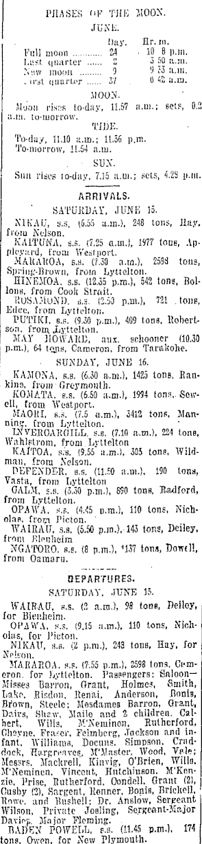 PHASES; "K TUB MOON. JUNK. (lay. flr. 111. Pull moon 24 ■ 10 B p.m. I.KSt. quarter 2 3 50 a.lll. .\'.iw moon 9 ' n.m. . irat diiurU'r 37 U a.m. AIOOX M'jon risrifi to-day, 11.57 a.m.; eel?, 0.2 a.m. to-morrow. TIM. To-day, 11.10 a.m.; 11.56 p.m. To-morrow, 11.54 a.m. SUX. Sim rises to-day, 7.15 a.m.; sets, 4.23 11.111. ARRIVALS. SATURDAY, JUNK 15. Nlh'AU, s.s. (5.55 a.m.), 248 tons, Hay, Iroiu Nelson. KAITUIv'A, s.s. (7.25 a.m.), 1977 tone, Applcyard, from West port. -MARAROA, s.B. (7.30 a.m.), 2593 tons, Spring-Brown, from Lyttelton. HINEIIOA. s.s. (12.35 p.m.), 542 tons, Bolloim, from Cook Strait. ROSAMUND. i.s. (2.53 p.m.), 721 , tolls, Kill'c, from Lyttelton. PUTIKI, b.s. (9.30 p.m.), 409 tons. Robertson, from .liy.ttelton. MAY HOWARD, am. schooner (10.30 p.m.), 64 tops, Cameron, from Tarakohe. ■ SUNDAY, JUNK 16. KAMONA, s.s. (6.30 a.m.), 1425 tonß. RanItins, from Grcymoulli. KOM ATA, s.s. (6.50 a.m.}, 1994 ton!?.. Seivell, Trom Weatport. MAORI, s.s. (7.5 a.m.), 3412 tons, Manning, from Lyttelton. UTVEHOAKGIIiL. s.s. (7.10 a.m.), 224 tons, Wahlstrom, from Lyttelton KAITOA, s.a. (9.55 a.m.), 305 tons, Wildman, from Nelson. DEFENDER, b.s. (U.EO a.m.), 190 tons, Vasta, from Lyttelton OALM, s.s. (3.30 p.m.), 650 tonß, Itadford, from Lyttelton. OPAWA, s.s. (4.45 p.m.), 110 tons, Nicholas. I'icton. WAIRAU, s.s. (5.50 p.m.).' 143 tons, Deiley, from Jlleuheim NGATORO, s.s. (8 p.m.), 1 137 tons, Dowd!, from Oamarti. DEPARTURES. SATURDAY. .JUNE 15. ' WAIR.AU, s.s. (2 a.m.), 98 tone, Deiloy, for Blenheim. OPAWA, s.s. (9,15 a.m.), 110 tons, Nicholas, for I'icton. NIKAU, s.s. (2 p.m.), 243 tons, Hay, for Nelson. JIARAROA. s.s. (7.55 p.m.), 2598 tons, Cemeron, for Lyttelton. Paspengerß; Saloon— Misses Barron, Grant, Holmes, Smith, Lake, Risdon, Renai, Anderson, Bonis, Bi'own, Steele; Mesdames Barron, Grant, Dairs, Shaw, llaile and 2 children. Calhert, Wills, Ji'Xeminen, Rutherford, Oheyne. Frafer, Felmberg, Jackson and infant, Williams, Docuns. Simpson. Craddock, Hargrt-aves, Jf'.Mastcr. Wood, Vele; Messrs. Macltrell, Kinvig, O'Brien, Willo, M'Neminen. Vincent., Hutchinson. M'Knnzio, I'riße, Rutherford, Oondell. Grant (2), Cushy (2), Sargent, ltonner, Bonis, Bricliell, Rowe. and Bushell; Dr. Anslow, Sergeant Wilson, Private Joallng, Sergeant-JEajor Davin». Major Fleming. BADEN' POWELL, s.s. (11.45 p.m.). 174 tons, Chven, for Now Plymouth.