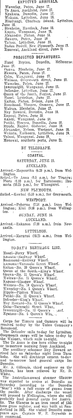 EXPECTED ARRIVALS. Waverley, Patea, June 17. To Anau, Auckland, June 17. Ngakuta, Dunedin, June 17. Wakiitu. Lyttelton, Juno 18. Himttangi, Chatham Island, Lyttelton, June 18. , Blenheim, Ilaveloek, June 18. Kapiti, Wangaiiui, June 18. Alexander. Picton, June 18. Hawera, Patea, June 18 Taimii,. Lyttelton, June 19. Baden Powell. New Plymouth. June 19. Monowai, Auckland direct, Junn 21 PROJECTED DEPARTURES. Hazel Rcpton, Dnuedin, Melbourne. June 17. Opawa. Blenheim, Juno 17. Hawera, Patea, June-17. Calm, Waiigantti, June 17. • Waimea. Gi'-.-yi.-Miuth direct, Juno 17. Waverley, Patea, Juno 17. lnvercargill, Wnusnnui, June 17, Defender. Lyttelton, June 17. Queen of the South. Fox ton, June 17. Maori. Lyttelton, Juno 17. Kttitoa. Picton, Nelson, Juno 17. Rosamond, 't'iniaru, Oamaru, June 17. Wairau, Blenheim, Juno 17. May Howard, Dnuedin, June 18. Kapuni, Patea, June 18. Kaniti, Wanganui. Juno It:. Putiki, Tiinnru, Uiinediu, Juno 18. Ripple. Napier, Gisbonie, Juno 18. Alexander, Nelson, Wcstport, Juno 18. Wakatu, Kaikoura, Lyttelton, Juno 19. Tainui, Wanganui, Juno 19. Monowai, southern ports, Juno 21. BT TELEGRAPH. COASTAL. SATURDAY, JUNE 15. AUCKLAND. Arrived.—Mapourika (6.20 p.m.), from Wellington. Saiie.l—Te Anau (9.5 p.m.), for Tiniaru; Flora 11.10 p.m.), for Raratonsa; Ihu- , matti (10.25 p.m.), for Whangarei. NEW PLYMOUTH. Sailed.—Kowliai (5.30 p.m.). for Greymouth. WESTPORT. Arrived.—Poherua (7.14 p.m.), from Wellington; Kiui (9.18 p.m.), from Wellington. 1 SUNDAY, JUNE 16. AUCKLAND. Arrived— Rakanoa (7.10 a.m.), from Newcastle. LYTTELTON. Arrivod.-Mararoa (10.25 n..m.1, from Wellington. TO-DAY'S BERTHAGE LIST. Maori—Ferry Wharf. Koaiulu—lUuhvay Wharf. Rosamond—Railway Wharf. Kaiuoua—Taraualii Street Wharf. ( Kaitoa—No. 10 Queen's Wharf. Queen of the South.—King's Wharf. Opawa—No. 11 Queen's Wharf. Wairau—No. 11 Queen's Wharf. Kapiini—Glasgow Wharf. Waimca—No. 14 Queen's Wharf. Waverley—No. 5 Queen's Wharf. Ripple—Pipitea Wharf. Putiki—No. 12 Qucon's Wharf. Defender—King's Wharf. ifay Howard—No. 13 Queen's Wharf. Calm—Taranuki Street What* Invercargill—No. 13 Queen's - ~ai'f. Ngatoro—No. 5 Queen's Whv-. Cargo for Titnaru and Oamaru will he received to-day by. the Union Company's Rosamond. The Defender sails to-day for Lyttolton. Greymouth cargo will be taken to-day by the Waiiucs, which sails to-night. The Te Auau iB due here either to-night or to-morrow morning from Auckland. The auxiliary schooner May Howard arrived late on Saturday night from Tarakohe. She will discharge cement to-duv and to-morrow load general cargo foi Dunediu. Mr. A. Gillespie, third engineer 011 the Kaitnna, has been relieved by Mr. 1). White. The Australian-owned steamer Glaucus was expected to arrive at Dunedin on Saturday _ (according to the Dunedin "Star") with a ful! cargo of guana from the pacilic. After discharge the vessel will proceed to ,Wellington, where she will probably load general cargo for Austra lia. The Glaucuß is an iron vo6sel of 1365 tons gross register, and was built, at Sunderland in 1878. She visited Dunedin some years ago. Captain W. R. Reynolds is in command. I