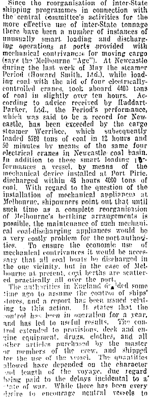 Since tho reorganisation of inter-State shipping programmes in connection with the central committee's activities for the j more effective use of inter-State tonnage | llicre have been a number of instances of i unusually smart, loading and discharc- j iup operations Ports provided with j mechanical contrivance for moving cargo (says the 'Melbourne "A.se"). At Newcastle I during the last week of May the steamer j I'eriod (Howard Smith, l.tri.), while "load- . in; coal with tho aid of four electrically-' controlled craned, tool: aboard 4403 tons ! of coal in slightly over ten hours. According to advice received by fluddartI'arker, bid., tho Period's performance, ! which wn.s said to be a record for New- ] castle, has been cxccedcd by the. cargo J steamer Werrihce, which subsequently j loaded 5780 tons of coal in 12 hours and 50 minutes by means of tho same four electrical cranes in Newcastle coal basin. In addition to those smart loading i Vforniauccs a vessel, by means of tho mechanical device installed at Port Pirie. discharged within 48 hours <000 tons of j coal. With rogard to the question of tho I installation of mechanical appliances at Melbourne, shipowners point out that until such time as a complete reooranieiiioit of Melbourne's berthing arrangements is possible, the maintenance of such mcchani- j cal coal-discharging appliances would bo | a very costly problem for the portauthouties. . To ensure tho economic use of I mechanical contrivances it would be necessary that, all coal bonis be discharged in | the one vicinity, tint in t.he ease of Mel-| bourne at. present, tn;il b'-rths are scattered practically all over the purt. I The aiiilrit'Uics in l-hi'/land ('c.-dcd some ] 1 Mine am to assume ihe control of ships' | -tores, "oik! a report has been issued relit- j ; inn to thin action. H states that tho .-on'rol has b""ii in operation for a year, | ; and has led to useful results. The con- i : I rot extended to provision", deck and ell- 1 ' ','ine equipment, drills, clothes, and all 1 i oilier articles purchased by the master : or members of the crew, and shipped i tor the use of the \cssei. The quantities , allowed have depended on the character I \'i-i length of the voyaje. due icgard I being paid to the delays incidental to a' | 'rite of war. While tliore has been every j ' .tjrire lo encourage neutral vetsels to ■
