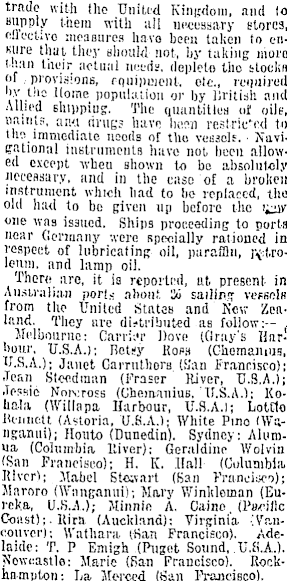 trade with the United Kingdom, and lo supply them with all necessary stores, eOeetivc measures have been taken to enKlire that they should not, by taking moro t-.ian their actual need?, deplete the fctockfi oi • provisions, tquipujcnl. etc., repaired b.vthe Koine population or by UritUh and Allied shipping. The quantities of oils, namis, an<i drug? have hesn rcstricTd to the immediate neods of the vessels. • Navigational instruments have not been allowed except "\vheu shown to be absolutely necessary, and in the ease of a broken instrument which bad to bo replaced, the old had to bo given up before the yw one was issued. Ships proceeding to ports near Germany were specially rationed in respect of lubricating oil, paraffin, petroleum, and lamp oil. There arc, it ia reported, lit present- in Australian porta ahou. 1 , 2o sailing vcfbolb from the United States and New £ca* land. They are distributed as follow:— . Melbourne: Carri;H' Dove (Gray's Harbour, U.S.A.): Betsy Koph (Ghcmamug, U.S.A.); Janet Garruthors. (San Francisco): .Tean Steed man (Frascr River, U.S.A.); Jessie Noivross (Ghemwiius. U.S.A.): Koliala (Willapa Harbour, U.S.A.I; Lottio iU-iiiiett (Astoria, U.S.A.); White Pino (Wanganui); Houto (Danedin). Sydney: Alumua, (Columbia River); Geraldine Wolvin (San Francisco); H. Iv. .llall (Columbia* River); Mabel Stwart (San Francisco); Maroro (Wnnganui); Mary Winkleinan (Eureka, U.S.A.); Minnie A. Caino, (Pacific Coast)Kira (Auckland): Virginia •!Vancouver); Wathara (Kan Francisco). Adelaide: T. P Emigh (Puget Sound, U.fl.A.). Newcastle: Marie (Ban Francisco). Rock-hn-mpton: La Merced (San Francisco).