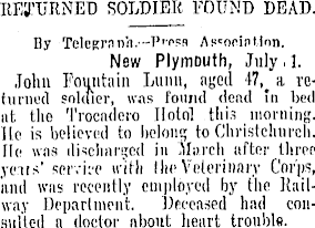 RETURNED SOLDIER FOUND DEAD. By TeleKrnnh. A florin Hon. New Plymouth, July, 1. John Fountain Lunn, aged a returned soldier, was found dead in bed at the Trocadero Ilotol this morning, lie is believed to belong to Christclinrch. He was discharged in 'March after three yens' service with I lie Veterinary Corps, 'and was recently employed by the Kailway Department. Deceased had consulted a doctor about heart trouble.