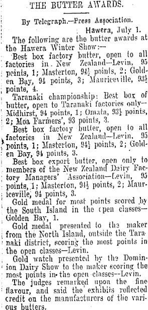 THE BUTTER AWARDS. i By Telegraph—Press Association. j , Hawera, July 1. i The following are the butter awards at the Hawera Winter Show:— Best box factory butter, open to all . factories in. New Zealand—Levin, 9j> : points, 1; Jlasterton, 9points, 2; Gold:en Bay, 91 points, 3; Miutriceiille, 93* ; points, 4. i Taranaki championship: Best box or : butter, open to Taranaki factories only— ' Midhirst, 94 points, 1; Onuta, 9% points, ; 2; Moa Farniers', 93 points, 3. Best box factoiy butter, open to all , factories in New Zealand —Levin, 95 'points, 1; Jlasterton, Mi points, 2; Gold- ■ en Bay, 91 points, 3. i Best box export butter, open onl.v to members of the New Zealand Dairy Fac- ; tory Managers' Association— Levin, 95 : points, 1; Masterton, 911 points, 2; Maur- : iceville) 91 points, 3. ' Gold medal for most points scored ,by ' the South Island in tho (pen classesGolden Bay, 1. Gold medal presented to tli3 maker i from the North Island, outside the 'i'ara- ! naki district, scoring the most points in ; the open classes—Levin. ; Gold watch presented by th? Domin- ■ ion Dairy Show to the maker scoring the ; most points in-the open classes—Levin. The judges remarked upon the fine : flavour, and said the exhibits reflected credit on the manufacturers of tlio various butters.