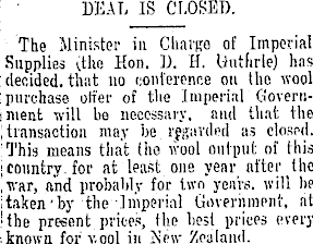 : ' DEAL IS CLOSED. ! The Minister in Charge of Imperial Supplies (the Hon. D. H. Uutfirle) has : decided, that no conference oil the wool ; purchase olfer of the Imperial Governiment will be necessary, and that the 1 transaction may be regarded as closed. This means that (lie wool output of this j country, for at least one yenr after the war, and probably for two years, will he itaken "by the Imperial Government, at ■the present prices, the best prices every ;known for wool in New Zealand.