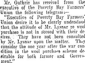 Mr. Guthrie has received from the executive of the Poverty Bay Farmers' Union the following telegrams— "Executive of Poverty Bay Farmers' Union desire it to be clearly understood that., the attitude of Mr. Lysnar re wool purchase is not in a'ccord with their desires. ! They have not been consulted by Mr. Lysnar upon the matter. They consider the one year after the war eon--1 ditioa in (he wool purchase scheme deleirablo for both farmer and Govem- : meat."