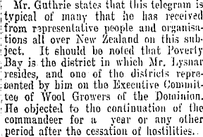 • Mr. Guthrie states that this telegram is J typical of many thut ho has received ■ from representative people and organisations all over New Zealand on this subject. It should bo noted that Poverty ;Bav is the district in which Mr. Lysnar ;resides, and ono of tho districts represented by him on tho Executive Committee of \Vool Growers of the Dominion. :He objected to tho continuation of the commandeer for a year or any other .period after tho cessation of hostilities..