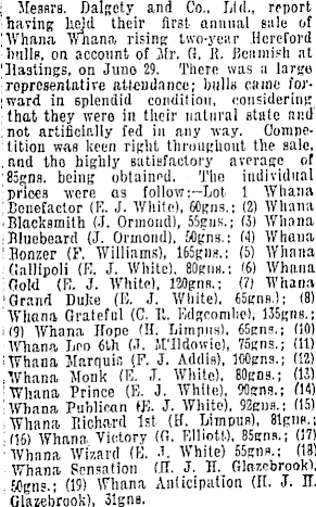 j Mesnrß. Dalgety and Co., Ltd., report i having he)d their first annual sale of | Whana Wnana rising two-year Hereford hulls, on account of Jlr. G. li, lieHim'sh at blastings, on Juno 29. There was a largo ■representative attendance; bull# caine for(ward in 6plendid condition, considering : that they were in their natural state and' ;not artificially fed in any -way. Competition was keen right throughout the sale, , and tho highly satisfactory average of '85ens. being obtained. Tho individual 'prices were as follow:—Lot 1 Whana IBonefaetor (E. J. White), 60gns.; (2) Whana • Blacksmith (J. Orniond), 55giis.; (3) Whana : Bluebeard (J. Oi'inond), Mgns.: (4) Whana ' Bonzer (F. Williams), 165gns.; (5) Whana Gallipoli (E. J. White). 80gns.: (6) Whana Gold (E. J- White), 120gns.; (7) Whana 1 Grand Duke (15. J. White), 65gns.); (8) Whana Grateful (C. 11. Edgcomlie), 135gii8.; i (9) Whana Hope (H. Limpus), 65gns.; (10) Whana, Leo 6th (.1. M'lldowie), 75gns.; (11) i Whana Jlarquif. (F. J. Addis), lOOgns.; (12) ■ Whana Monk (13. .T. White), SOgns.; (13) ; Whana Prince (13. J. While), 90gns.; (14) : Whana Publican 03. J. White), 92gus.: (15) Whana Kichard Ist (H. Limpus), Slriib. ; : (16) Whana Victory (0. Elliott), 85nn«.; (17) Whana Wizard (E. White) 55gnf>.; (18) Whana Sensation (IT. J. H. Glazcbrook). , JCgns.; (19) Wlmna Anticipation (K. J. IT. Glaiebrook), 31gne.