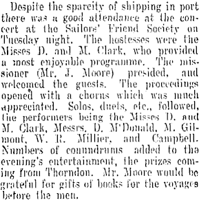 Despite the sparcily of shipping in port there was u good attendance at (he concert at (ho Sailors' Friend Society on Tuesday night. 'I'lie hostesses were the Jlisses D. nn.l M. Clark, who provided a most enjoyable programme. The missioner (Mr. J. Moore) presided, and welcomed the guests. Tlie proceedings opened with a chorus which was much <t|iprecinted. Solos, duels, etc., followed, Cue performers being the Misses I), and JL Clark, Jlessrs. 0. JPDonald. Jl. Gil--111011I:, W. R. Millier, and Campbell. Numbers of conundrums added to (lis evening's entertainment, Ihe prizes coming from Thorndon. Jlr. Moore would bo grateful for gifts of books for the voyages before Ihe men.