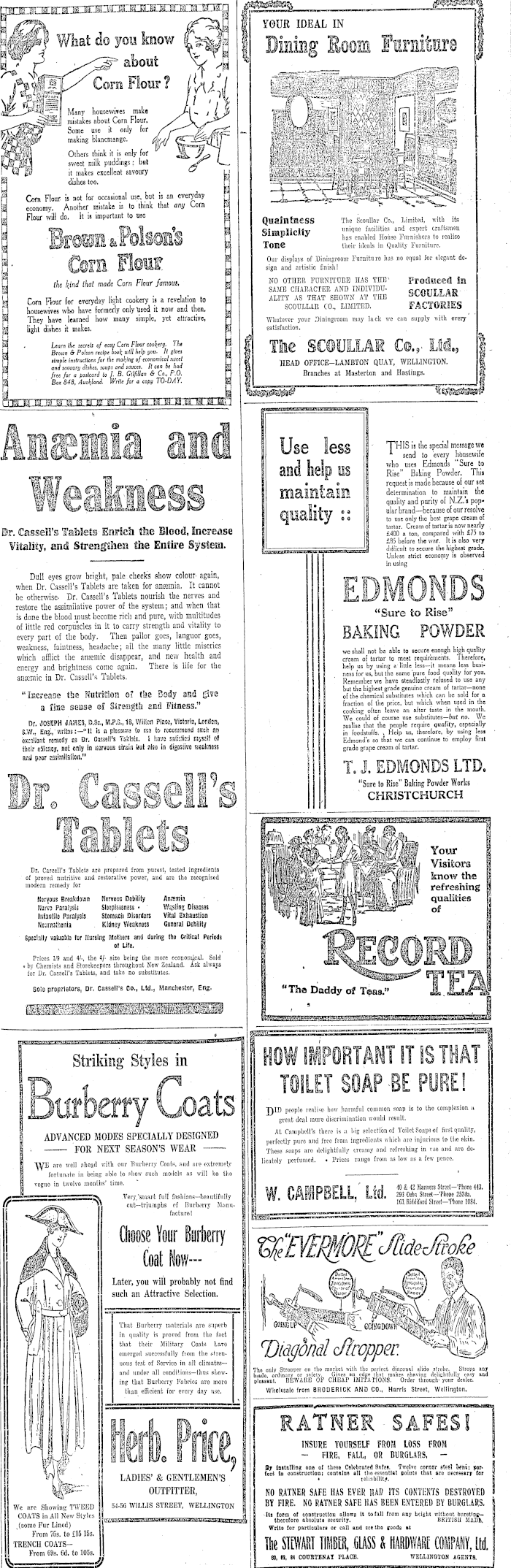 B f*3lh I! YOUR IDEAL IN I jffip) what do yms know WW I Dining Room Fnrnitnre J j J?l_^V-^l : -~~ Many house wi«s make J\ ., jI % t mM fral Ifclltfe? mii about Corn Flour. ' g||P rnakung blanche, fy/ i ! Jw Others think it is only for M. y~ I B&ra#sl;s^^^ QrBB sweet milk puddings; but > £¥$ it makes excellent savoury & u ' : H dishes too. n s^^ i; =^^^#W%^ij^§^4 i fl Corn Flour is not for occasional we, but is an everyday J _JL-4b~-3« 1 " ■ - I economy. Another mistake is to think that any Corn ® ->•*-, "-w. j Flour will do. It iB important to use ti Q ua i n ftie S S The Scoullar Co., Limited, with its ! J Wto fU H.«« \4 3imirtH<>lfv I,nicl " G facilities alld oxnDrt "aftsmen t 'Mfl'MMli a U Slffi»P«"«y h aS enabled House Furnishers to realiso , J yiWIfieSaWWiSW g Tone their ideals in Quality Furniture. J K Our displays of Diningroom Furniture has no equal for elegant de--1 ' tOOI. ft iQlll*. y sign and artistic finish! H They nave learned how many simple, yet attractive, *J Whatever your .Oiningroom may lack we can supply with every ■ I light dishes it makes. % satisfaction. B . Urn At uerd, rf tow Com Flour Motor- The % f nP]j»A $f flll JO.AI? (]©„. LffiL. I U Brow APohonrulptLk will help you. !l ghu J | . IIWS JLitLUt) |- R simple instructions forth making of cconomicoUccd »j- ,| OFFIC E-LAMBTON QUAY, WELLINGTON. ffi fei and saooury dishes, soups and sauces. II can bt had & S , „ jS n fro. for a postcard to J. B. Gilfillan & Co., P.O. "}■ S Branches at Maaterton and Hastings. a Box 848, Auckland. Write for a copy TO-DAY. & g B — ———- ■ r% ili mm 1 1 $m 1 ill SI USG iCSS ' THIS is the special message we _„ J L„l_. ~„ who uses Edmonds "Sure to ■ aeCl Heap US Rise" Baking Powder. This rf fa? *m*Sm x«&a /Ssm * s ° I request is made because of our set lH|. jfj| $M \%&MW $[m CI I determination to maintain the MM W' «. " 1 quality and purity of N.Z.'« popWIM •%^^ s >Al§,AS&&^s^&t ptnanHr 09 ularbrand-because of our resolve OlaOtlliy oo to use only the best grape cream of __ _ ... _.«._,.-.« ,««■.» 8 tartar. Cream of tartar is now nearly ©r. Cassell's Tablets Enrich me Mood, Increase | £ 400 a ton, compared with £75 to ' Vitality, and Strengthen the Entire System. S^^^BiS Unless strict economy is observed "~~~~~~~~~~~ "~ in using Dull eyes grow bright, pale cheeks show colour again, _g .__ „ — Bk f O when Dr. Cassell's Tablets are taken for ansmia. It cannot L I | |l/| | | |%| | | W be otherwise. Dr. Cassell's Tablets nourish the nerves and JTj Jy? \J? fc»/ restore the assimilative power of the system; and when that ( }J is done the blood must become rich and pure, with multitudes blire to Kise of little red corpuscles in it to cany strength and vitality to OAF/IMP PnWTWI? every part of the body. Then pallor goes, languor goes, DAfkinU rv/VVUTiR weakness, faintness, headache; all the many little miseries be Becureenough high quality which afflict the anaemic disappear, and new health and crcam of tnrtar t0 mcet rcqu i r emehts. Therefore, energy and brightness come again. There is life for the 8 help us by using a-little less-it means less km- "" • • -n- n_„ n>„ T>„uui- ' 1 ness tor us, but the same'pure food quality lor you, anasmic in Dr. Cassell s Tablets. • Remembe ; we have Bte J (ast i y retuse d to use any . S but the highest grade genuine crcam of tartar—none ' "increase the Nutrition o? me Body aua give 0 f the chemical substitutes which can be sold for n a line sease of Strengtb aad Fitaess." %g it&^^ltZi. Dr. JOSEPH Mo, *M, 18, Wilton Place, Victoria, Lcrdcn, l!^*&^rs?^^ 8.W., Eng.,'writes:-"It is a ploasura to ma to recommend such an ? in foodstut/s. » Help us, therefore, by using less • excsliont ramotly as Dr. Casssll's TaSlats. i have satisfied myasff ef | Edmond's so that we can continue to employ first their offlcacy, not only in nervous sirairi but also in digosiive weakness \ j Bra de grape cream o( tartar. " tWJi "" ,Ufa -" B i TV J. EDMONDS LTD. fk «n m ■ <<?*% 111 " Sure lo Rise " Bakin & Powder Worts VUo9 Vli '8 ■ ' CHRISTCHURCH Dr, Cassell's Tablets are prepared from purest, tested ingredients i f \ «.u \ of proved nutritive and restorative power, and are the recognised !If ||ffirasA//^—-w' r If/If KIIOW the | modem remedy for j 1 |j^^»^|£ftjjifiM 9)1111'" refreßhin S I Nervous Breakdown Nervous Debility Anamia - | j M "IffiM qualities • flim Paralysis Sleeplsssnass • ' Wasting Diseases j of ' Infantile Paralysis Stomacf) Disorders Vital Exhaustion I ™* \ Neurasthenia . Kidney Weakness General Debility j' Bpf'lUE&-a_J ' | Specially valuaalo for Nursing Mothers ami during the Critical Periods i *^^raW s l/# dFfa. fPsf\ 1 Prices 1/9 and 4/-, the 4/- size beinj the more economical. Sold ] •by Chemists and Storekeepers throughout New Zealand. Ask always | , Bffiaa I *a^ y ee&i >ea a^ isy i ior Dr. Cassell's Tablets, and take, no substitutes. ! . ffj I Sola proprietors, Dr, Cassell's Co,, Ltd., Manchestor, Er)g. \ M Tha Daddy of Teas." JL i£jri&^ I Striking Styles in j HOW ImPORI ANI IT IS loAl I 1 Ji IULIr LJioX A. ¥ \t_*il 'LJoL til T)ID peoplo renliso how harmful common soap is to tho complexion u . , ; | dbastr *ssiv& V& , W* W | j mm , 6 ( ]j scr j m j na ti on wou i,i result. I imnxmnn ci r»nnT at t v rnxJTfTJPn E I At Campbell's there is a big selection of Toilet Soaps of first quality, I ADVANCED MODES SPECIALLY DESIGNED 1 Rnd from ingi . e(]icnts whicl| m . O injm . ious lo tllo 6kill . [ ■ FOR NEXT SEASON'S WEAR [ T ) lese fionps aro delightfully creamy and refreshing in vso and are doE ~„ ~, , ... -r, , r , . , , , II licatoly perfumed. . Prices range from as low as a few pence. I TiUl are well ahead with onr Burberry Coats, and are extremely | I liv -'"- u 'J ' I fortunate in being able to show such modelß as will be tho I | . ' rogno in twelve months' lime. " « fl y A A FlUEiari I' I U 40 £42 Manners Strsct-'Phone 443. Very-stuart full fashians-f.eau