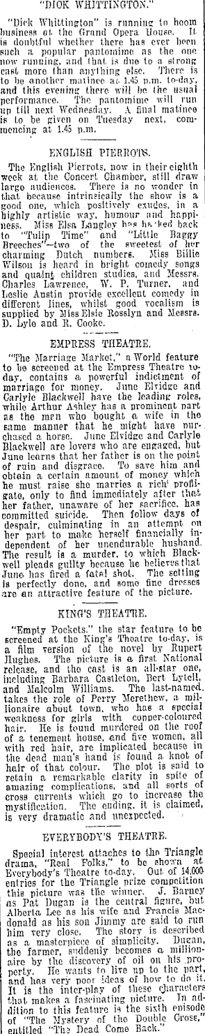 "DIOK WHITTINGTON." "Dick Whittington" is running to hoora business at. the Grand Opera House. TL is doubtful whether there has ever been such a popular pantomime as the one now running, and that is duo to a strong cast moro than anything else. There is to bo another matinee at. 1.45 n.m. to-day, and this evening there will be the usual performance The pantomime will run up till next Wednesday. A finnl matinee is Lo be Riven on Tuesday next, commencing at 1.45 p.m. ENGLISH PIERROTS. The English l'ierrots, now in their eighth week at the Concert Chamber, still draw largo audiences. There is no wonder in that because intrinsically the Bhow is a good one, which positively exudes, in a highly nrtißtic way, humour and happiness. Miss Elsa Langloy h»n hs.-ked back to "Tulip Time" and "Little Baggy Breeches —two of the sweetest of her charming Dutch numbers. Miss Eillie Wilson is heard in bright comedy songs and quaint children studies, and Messrs. Charles Lawrence, W. P. Turner, and Leslie Austin provide excellent comedy in different lines, whilst good vocalism is supplied by Miss Elsie Rosslyn and Messrs. D. Lylo and It. Cooke. EMPRESS THEATRE. "The Marriage Market," a World feature to he screened at the Empress Theatre today, contains a, powerful indictment of ma'rriago for money. June Elvidge and Carlyle Blackwell have the leading roles, irhilo Arthur Ashley has a prominent part as the men who bought a, wife in tho same manner that he might have nur-, chased a horse. June Elvidge and Carlyle Blackwell are lovers who are engaged, hut June lehrns that her father is on the point of ruin and disgrace. To save him and obtain a certain amount of money which he must raise Bho marrios a rich 1 profligate, only to find immediately after that her father, unaware of her sacrifice, has committed suicide. Then follow days of despair, culminating in an attempt on her part to make herself financially independent of her unendurable husband. The result is a murder, to which Blackwell pleads guilty because he believes that Juno has fired a fatal shot, Tho setting is perfectly done, and some fine dresses .ire an attractive feature of the picture. KING'S THEATRE. "Empty Pockets." the star feature to bo screened at the King's Thoatre to-day, is a film version of the novel by Rupert Jlughes. The picture is a first National release, and tho east is an all-star one, including Barbara Castleton, Bert Lytell, and Malcolm Williams. Tho last-named, takes the role of Perry Mcrethew, a millionaire about town, who has a special weakness for girls with copper-coloured hair. He is found murdered on the roof of a tenement house, and five women, all with red hair, are implicated because in the dead man's hand is found a. knot of hair of that colour. Tho plot iB said to retain a remarkable clarity in spite of amazing complications, and all sorts of cross currents which go to increase the mystification. The ending, it is claimed, is very dramatic and unexpected. EVERYBODY'S THEATRE. Special interest attaches to IJin Triangle drama, "Real F01k3," to be shown at. Everybody's Thoatre to-day. Out, of 14,00 ft entries for the Triangle prize competition this picture was the winner. J. Barney as Pat Dugan is the central figure, but Alberta Lee as his wife and Franciß Macdonald aB his sou Jimmy arc said to ran him very close. The story is described as a masterpiece of simplicity. Dugan, tho farmer, suddenly becomes a millionaire by the discovery of oil on his .property. He wants to live up to the part, and has very poor ideas of how to do it. It is the inter-play of these characters that makes a fascinating picture. In addition to this feature is the sixth episode of "The Mystery of tho Double Cross, entitled "Ths Dead Come Back.'