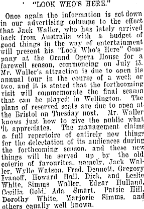 • "LOOK WHO'S HEBE." Once apjaln tho information is set down in our advertising columns lo the effect that Jack Waller, who has lately arrived bad: from Australia with a budnct of uood things in the way of entertainment will -present bin "Look Who's Hero Company at the Orand Opera House for a farewell season, commoncinir on July 13Mr. Waller's attraction is due to open its annual tour in the course of a wee!; or two. and it is stated that the forthcoming visit will commemorate the final seanon that can be played: in Wellington. The plans of reserved scats arc due to onen at the Bristol on Tuesday noxt. Mr. Waller knows ju3t how to sive tho public what 'it appreciates. Tho management claims a- full repertoire of entirely now tliiiisM for the delectation of its audiences during the forthcomine season, and these new things will be served up .by tho old coterie of favourites, namely. Jack Waller Wylio Watson, Fred. Bennett. Grcpiory Iviinoff, Howard Hall. Did;, and Leslie White, Simms Waller. Tidwir Hulland, Oc.ilia Gold.' Ada Smart. Patsic .Hill. Dorothy White, Mnrjorio Rimmß, and others equally well known.