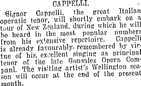 OAPPEUI. Signor Ouppelli. the ereat Italian operatic tenor, will shortly embark on a tour of New Zealand, during which he will ho heard in the most popular numbers from Mb uxtcimive repertoire. Cappclli is already favourably, remembered by virtue of Ms, excellent singing as principal tenor of t'no late Bonaalcz Opera Companl. The visiting artist's Weilington seaSoil will occur at the end of the present month.