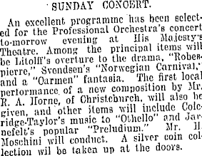 SUNDAY CO-N'OERT. An excellent programme has been selected for the Professional Orchestra b concert tomorrow evening at. His MaJ<Hir> Theatre. Among the principal items will be Litolifs overture to the drama. Robesnierrc," Svondsen's "Nonvcgian Carnival, and a "Oarmen" fantasia. The first local performance, of a new composition by Mi. H. A. Home, of Ohrist.cbnrch, wll also be given, and other items will include Cole-ridge-Taylor's music to "Othello and Ja.nefelfs popular "Preludium. Mr. 1 . Moschiui will conduct. A silver con collection wil bo taken up at the doois.