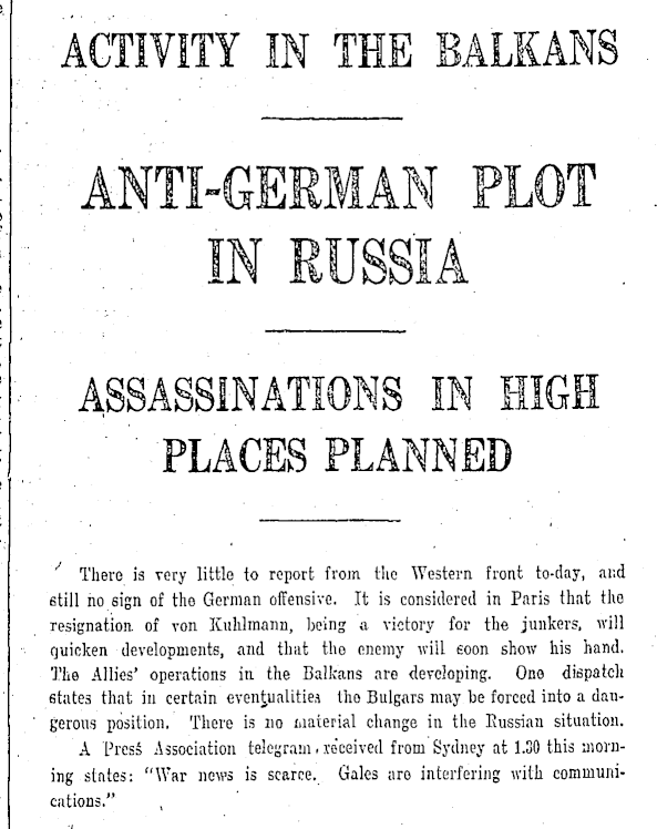 e. ACTIVITY IN THE BALKANS B•' ■ ■ f- : , ' • ■ e 0 " ______^___ t ■ ; ; ASSASSINATIONS IN HIGH i . ■' '' PLACES PLANNED B '■ ' ■ 1 - - . ■ ' t ... . / There is very little to report from the Western front to-day, and still ho sign of the German offensive. It is considered in Paris that tho resignation of von Kuhlraann, being a victory for the junkers, will quicken developments, and that the enemy will eoon show his hand. The Allies' operations in the Balkans are developing. One dispatch states that in certain eventualities tho Bulgars may be forced into a dan- ' gerous position. There is no Material change in the Russian situation. 5 . A PresS Association telegram. received from Sydney at 1.30 this morning states: "War news is scarce. Gales aro interfering with communi- ' cations." ,